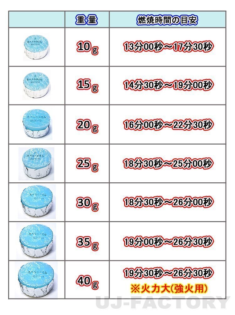 | 【 ここがポイント 】 ★多くのホテルや旅館で色々な料理に使用され、固形燃料の国内シェアナンバーワン! ★家族で好みの一人鍋が人気上昇中!また、アウトドアでの簡単調理に大活躍♪ ★炭や薪への着火材としても使用可能です。 ★カエン・ニューエースEの特徴 ①1個ずつ親切表示:すべてに製品サイズ(グラム数)と「食べられません」を表示しています。 ②手間いらず:アルミ箔のカップでそのままコンロに!廃棄も簡単です。 ③確実に着火:ロングライターの火で、直ぐに着火します。 ④すばやく加熱:初期火力が強いので、料理をどんどん加熱。 ⑤燃焼状態が安定:料理の出来上がりにバラつきがありません。 ⑥臭いが少ない:消臭剤配合で、消化時の臭いを低減(一部商品除く) ※製品は10g・15g・20g・25g・30g・35g・40gで、用途に合わせて最適なサイズをご利用ください。 【重要】 ※保管する場合は、固形燃料の特性上、長期間空気に触れますと気化しますのでラップやジップロック等でくるみタッパー等で密封した状態で保管することをお勧めします。