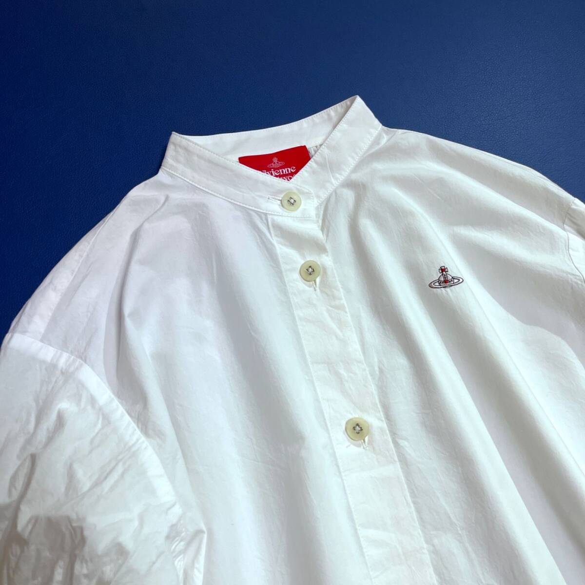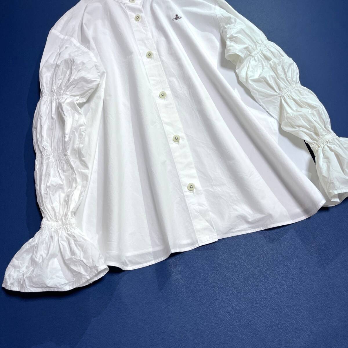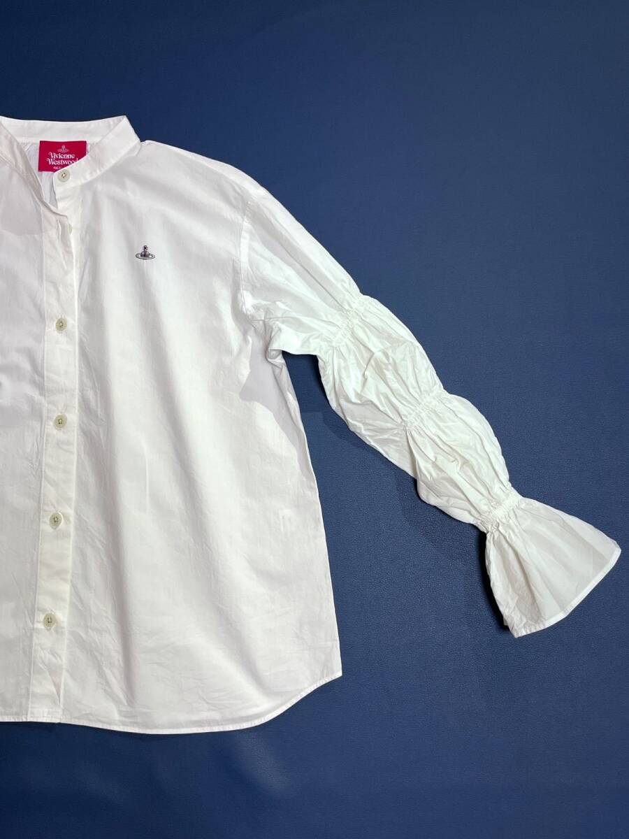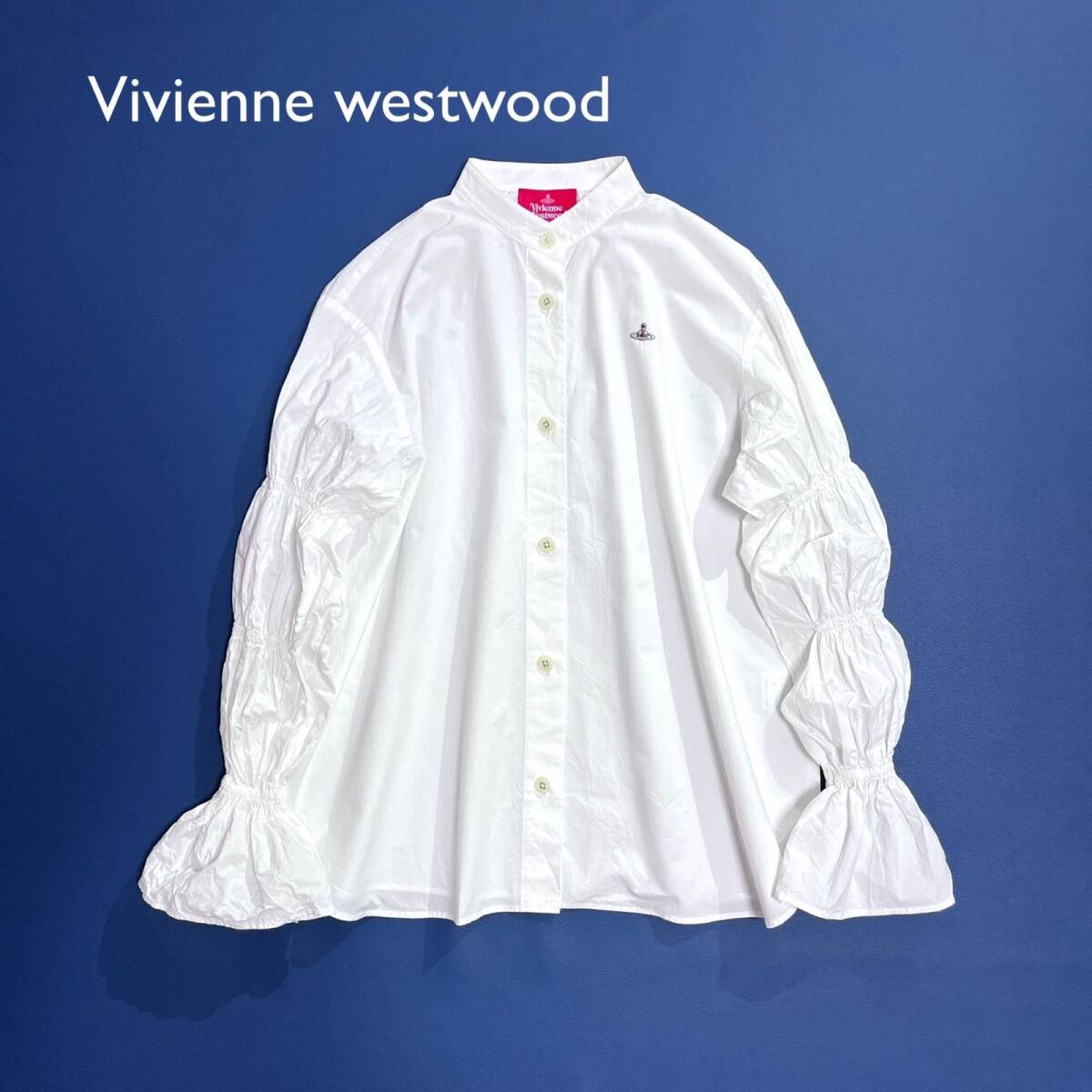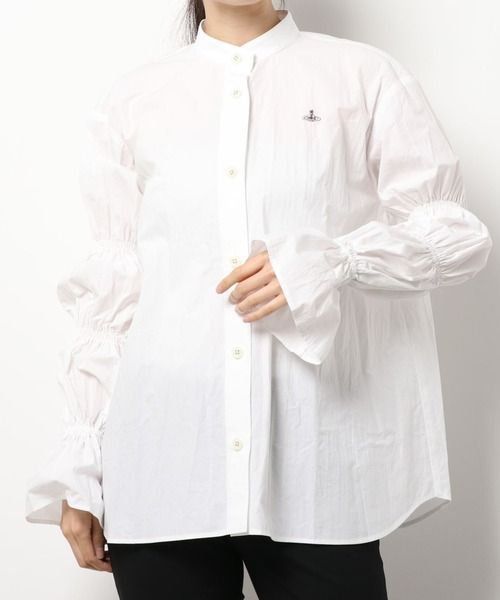 ギャザースリーブシャツ パフスリーブシャツ オーブ オーブ刺繍 オーブロゴ 長袖 ブラウス ゆったり 大きめサイズ シャツ ボタン バンドカラー ノーカラー 日本製 made in japan