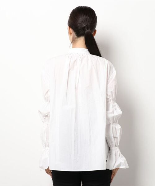 シャーリングで何段にもパフになった袖のシャツ。フェミニンなボリューム袖にスタンドカラーがスタイリッシュ。シンプルなボトムと合わせても様になる、うれしい一枚です。