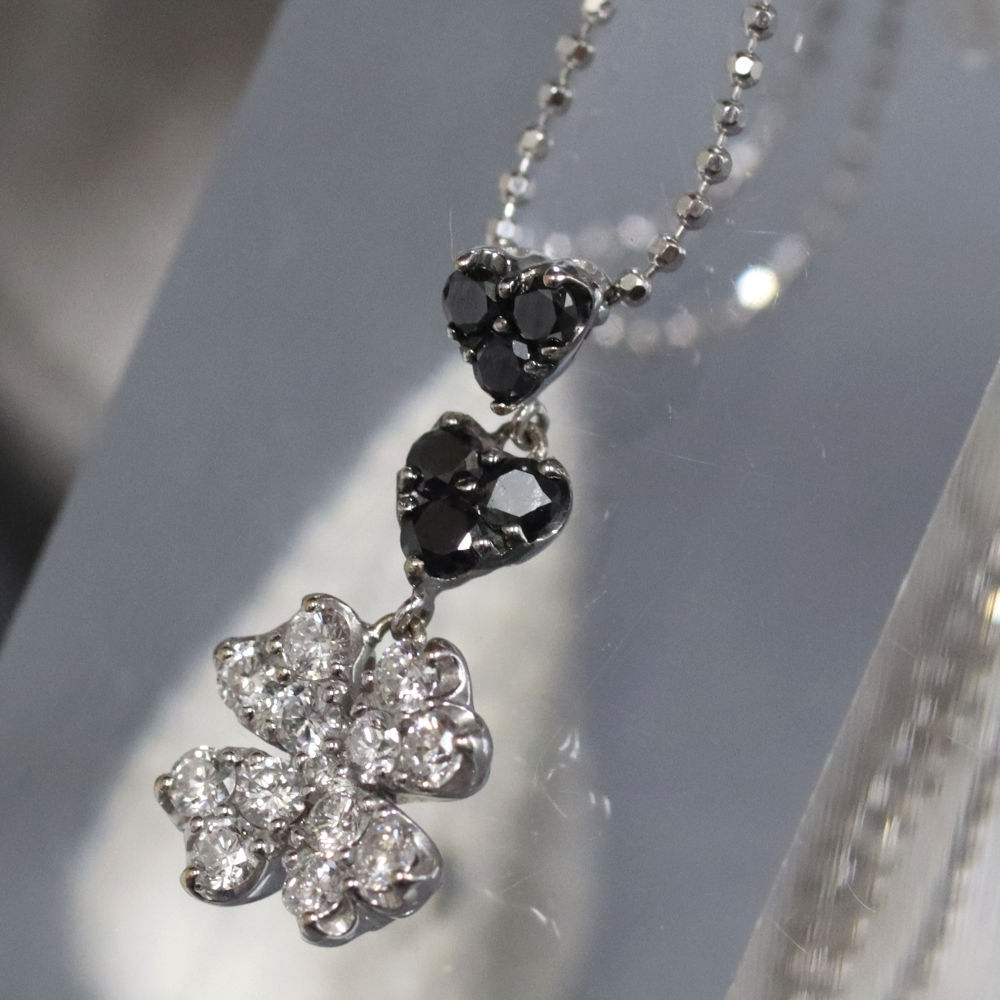 K18WGダイヤモンドクローバーペンダントの中古品です。 ハートとクローバーのデザインがとても可愛らしいです。 ダイヤモンドはインクルージョンが少なく、照り輝きも良いものが使われております。 ブラックダイヤモンドにはテーブルに研磨によると思われる傷のようなものや極小の欠けがあります。 チェーンはアジャスター付きなので、チョーカーのように短めにしてご使用いただいてもかわいいと思います。 地金部分の小傷はあまり目立ちません。