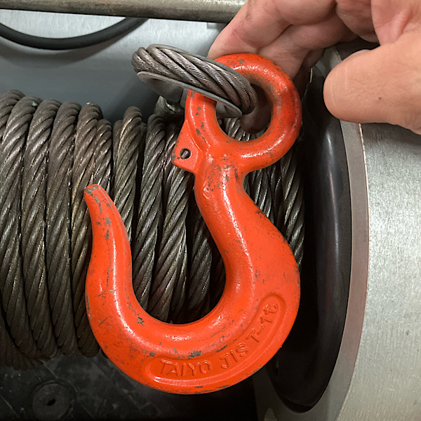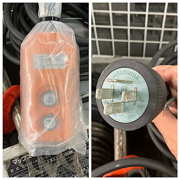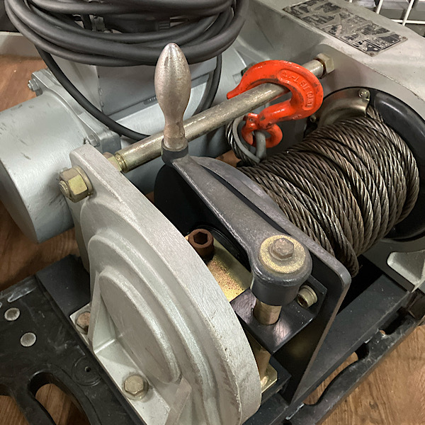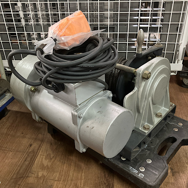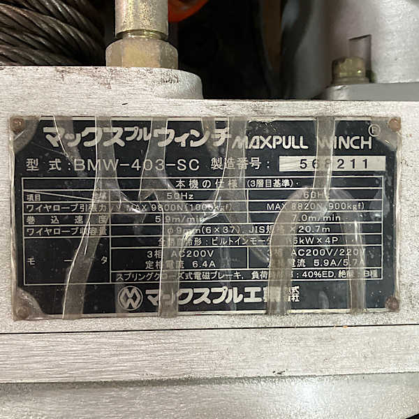 | 規格・仕様 | ・型式:BMW-403-SC ・電源:三相200V 50Hz/60Hz ・ワイヤーロープ引張力:50Hz MAX9800N(1000kgf) / 60Hz MAX8820N(900kgf) ・巻込速度:50Hz 5.9m/min / 60Hz 7.0m/min ・ワイヤーロープ収容量:φ9mm(6x37)、JIS規格x20.7m |