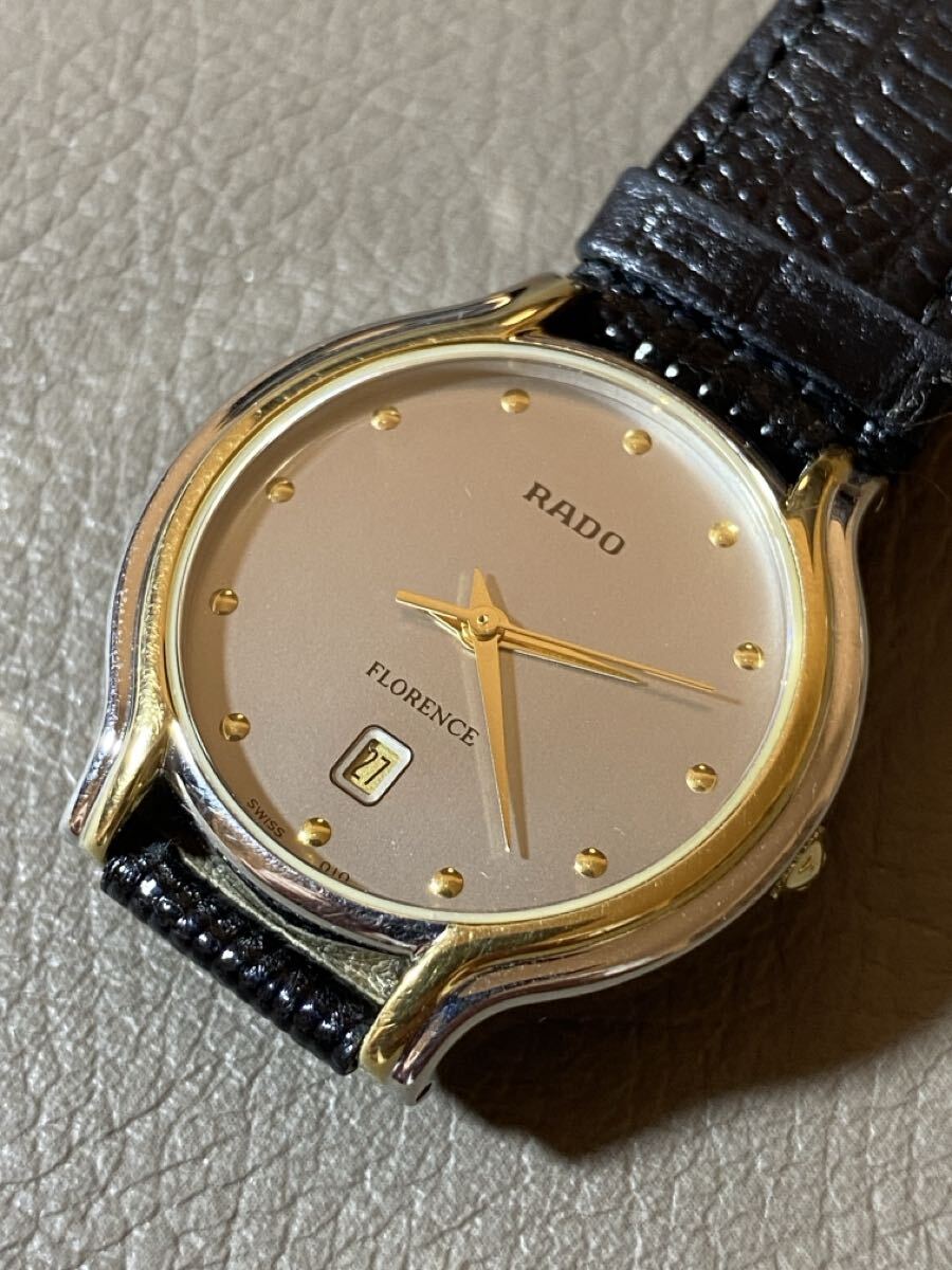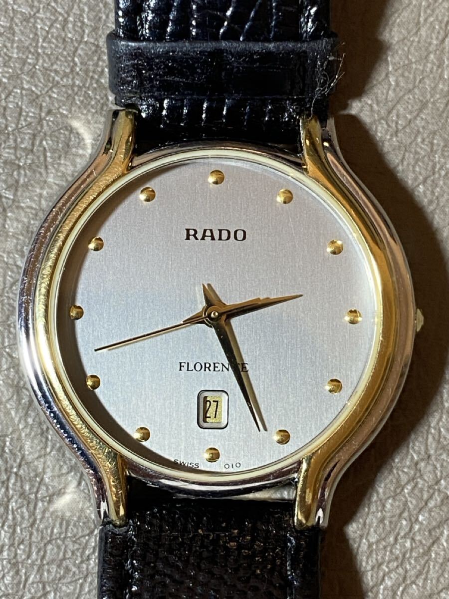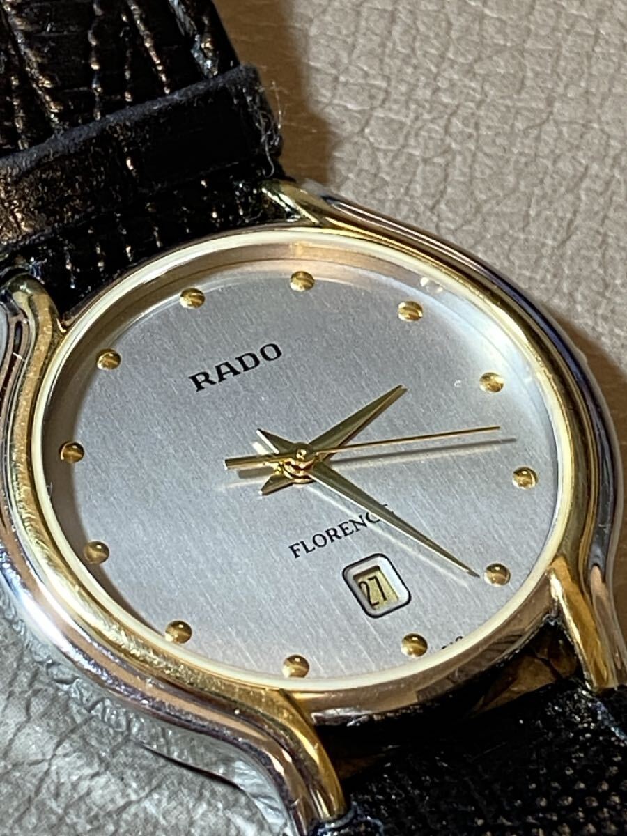 シルバーの文字盤にゴールドのインデックスが映えるRADO FLORENCE、日付表示機能付き。
