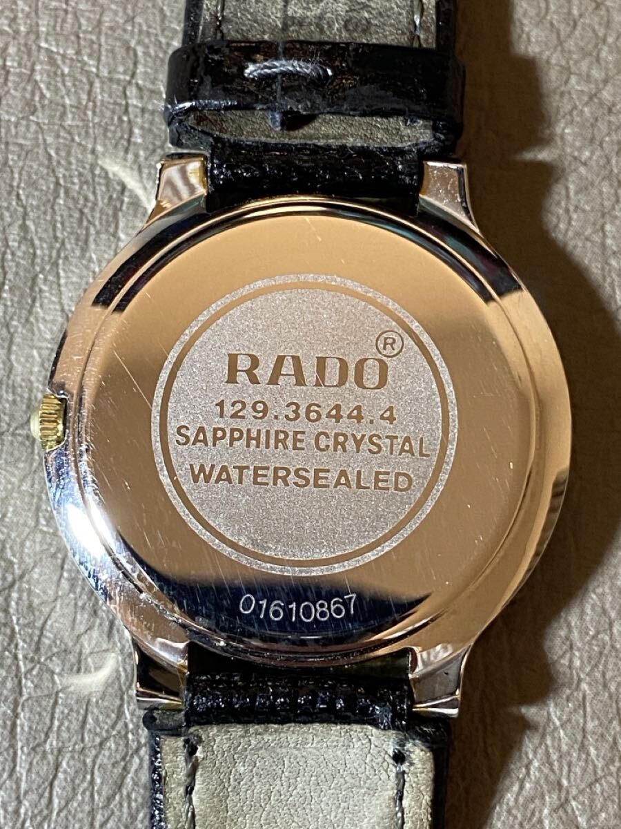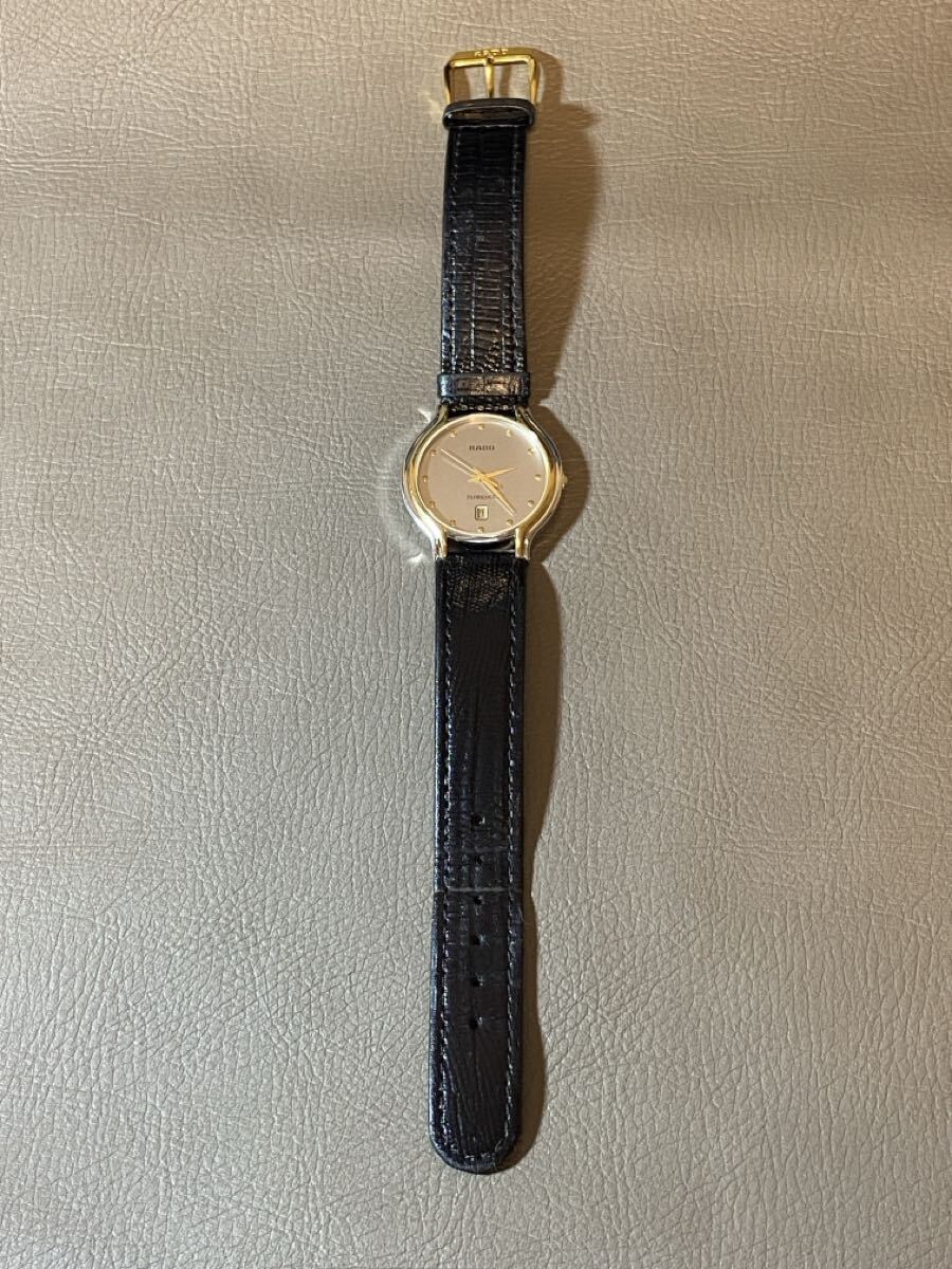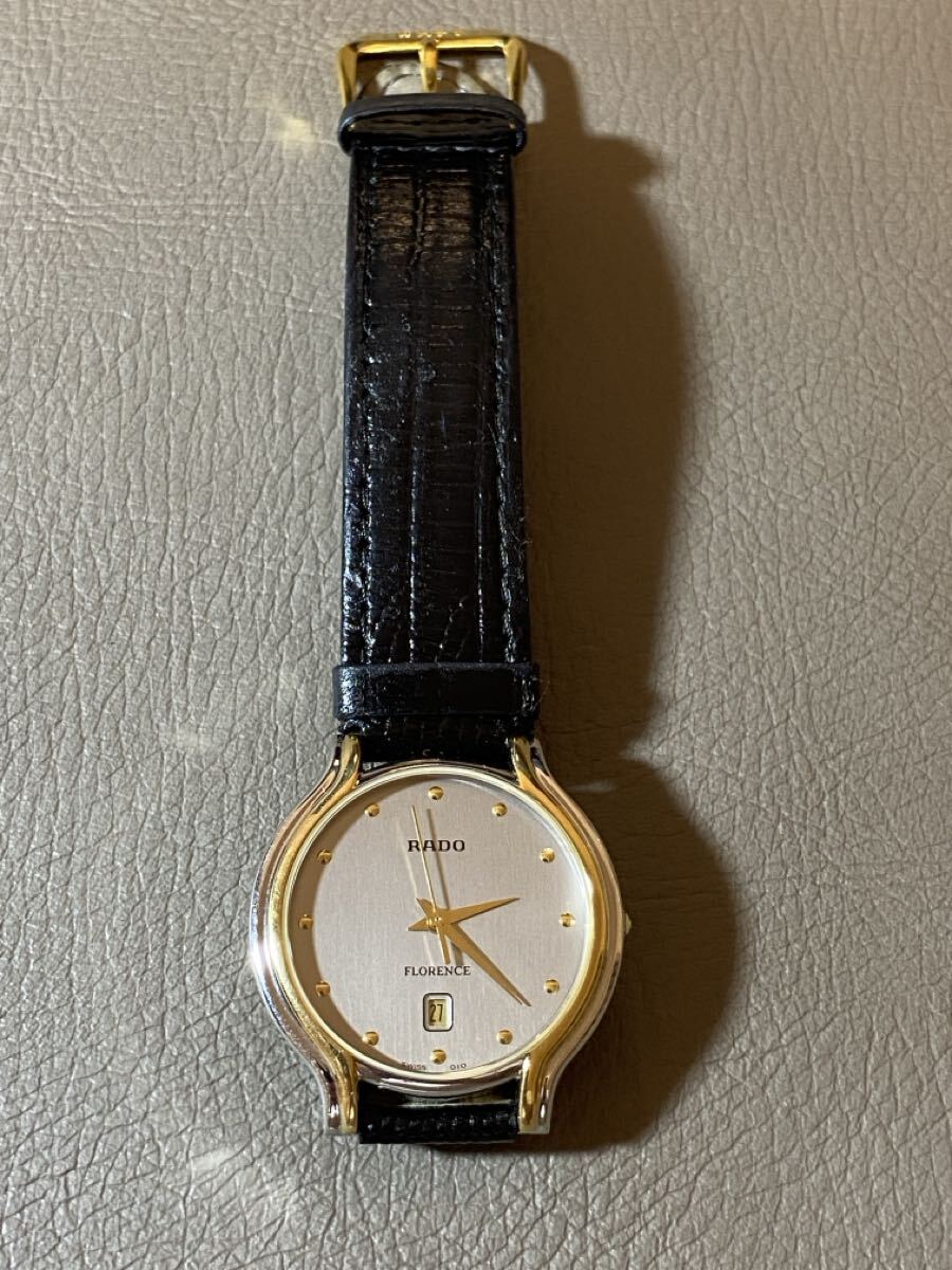 シルバーの文字盤にゴールドのインデックスが映えるRADO FLORENCE、日付表示機能付き。