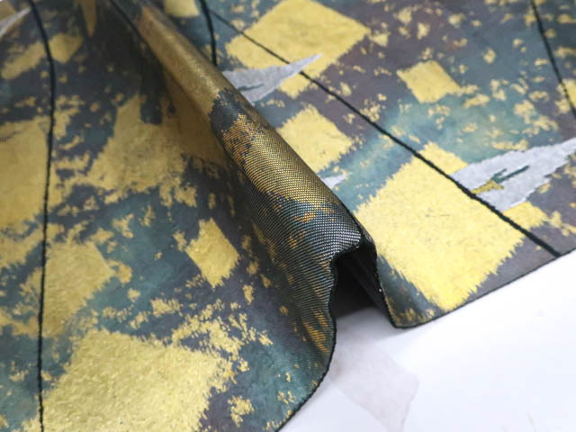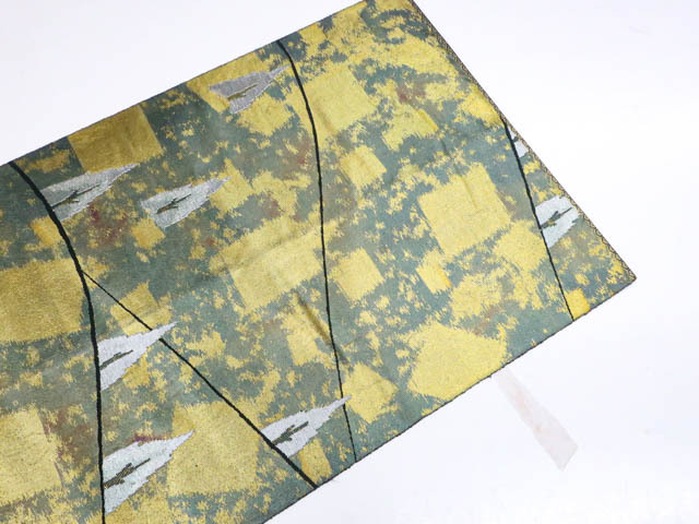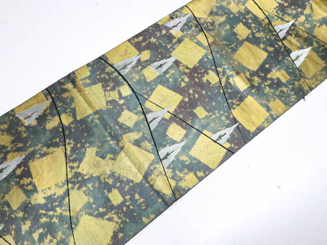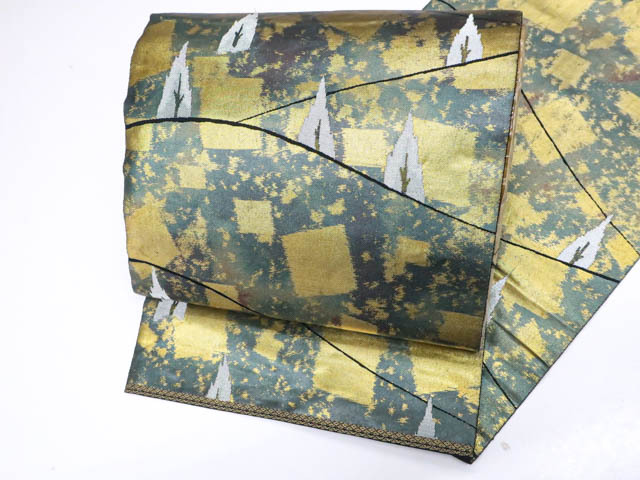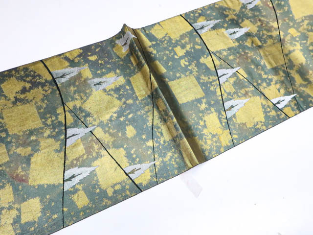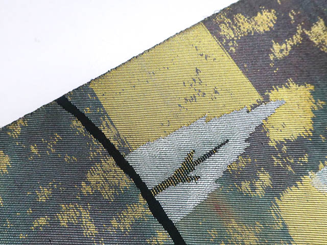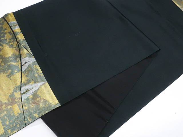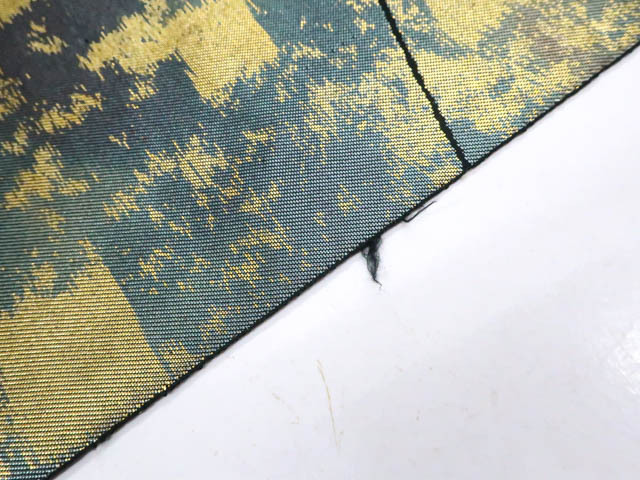 リサイクル商品の為、無地場に薄汚れがございます。 耳糸飛び出しがございます。 所々スレがございますがご着用いただけると存じます。 地色は深緑・金です。 1枚目の画像が近いお色かと思われます。 素材は正絹です。 |