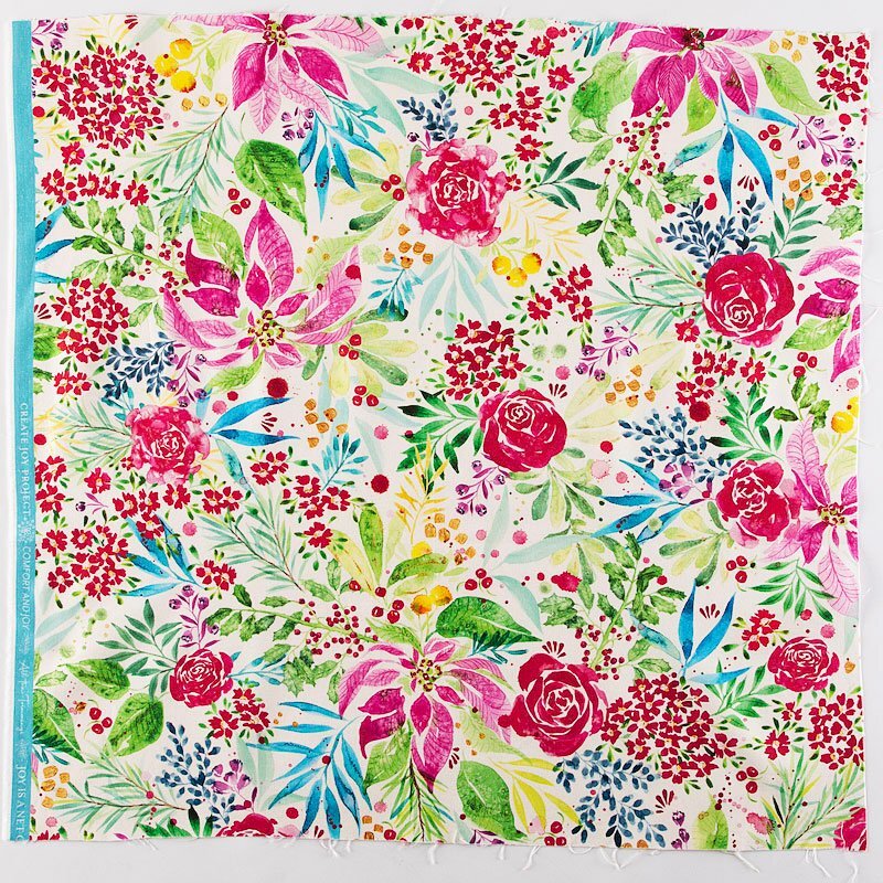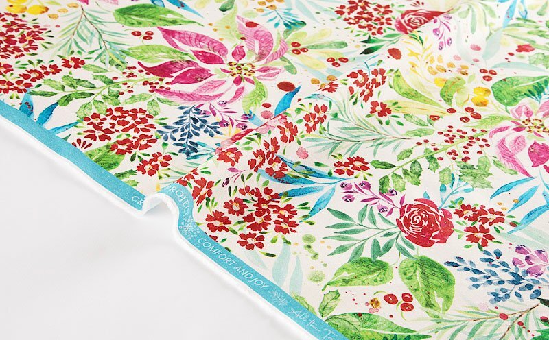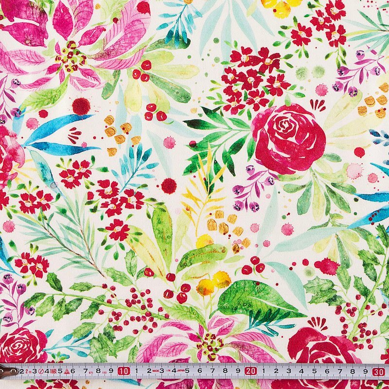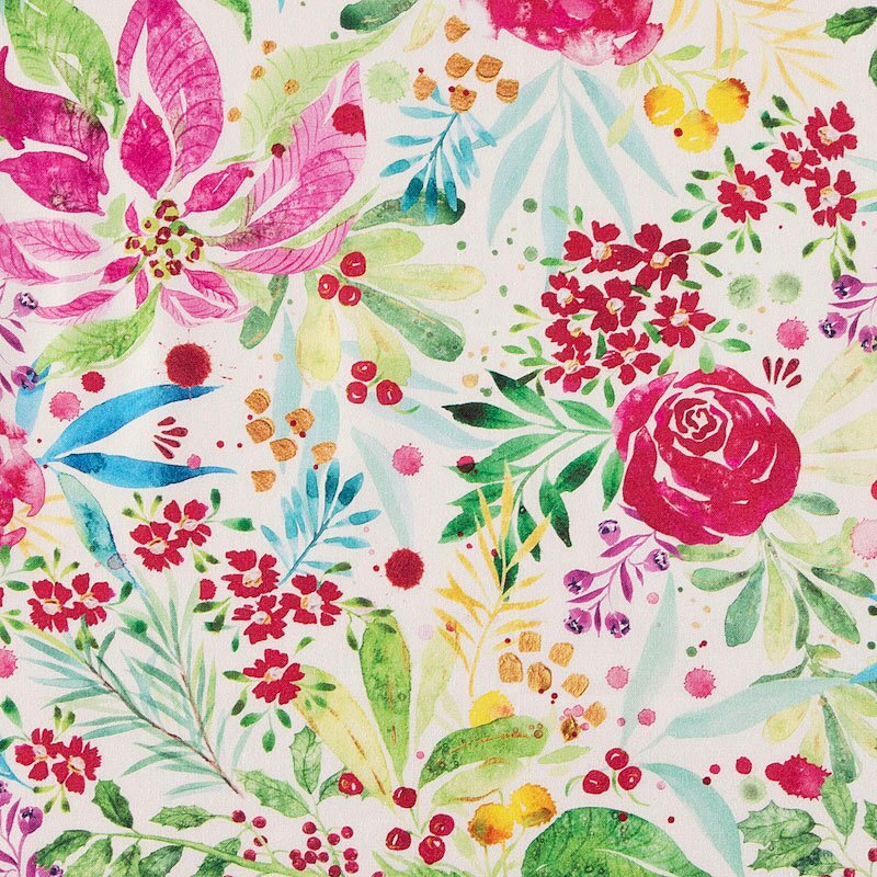 輝かしいピンクやライムグリーンで色付けられたポインセチアや真っ赤なバラやヤドリギの果実が楽しく彩るクリスマス柄。
