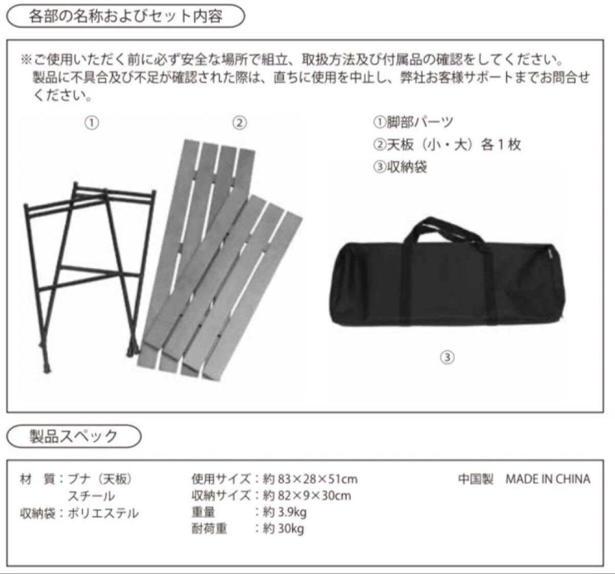 素材:ブナ(天板)、スチール(脚部)、ポリエステル(収納袋)