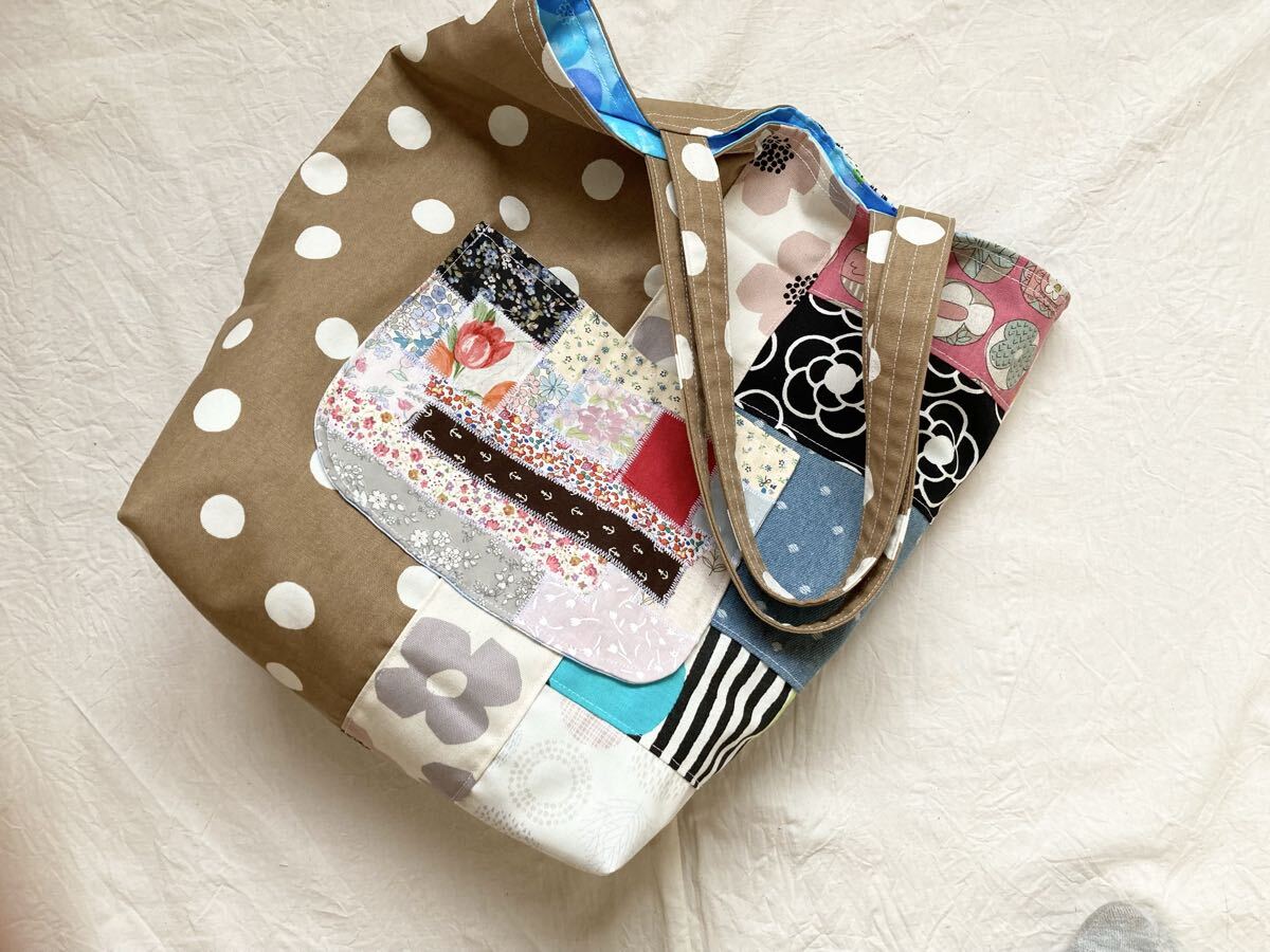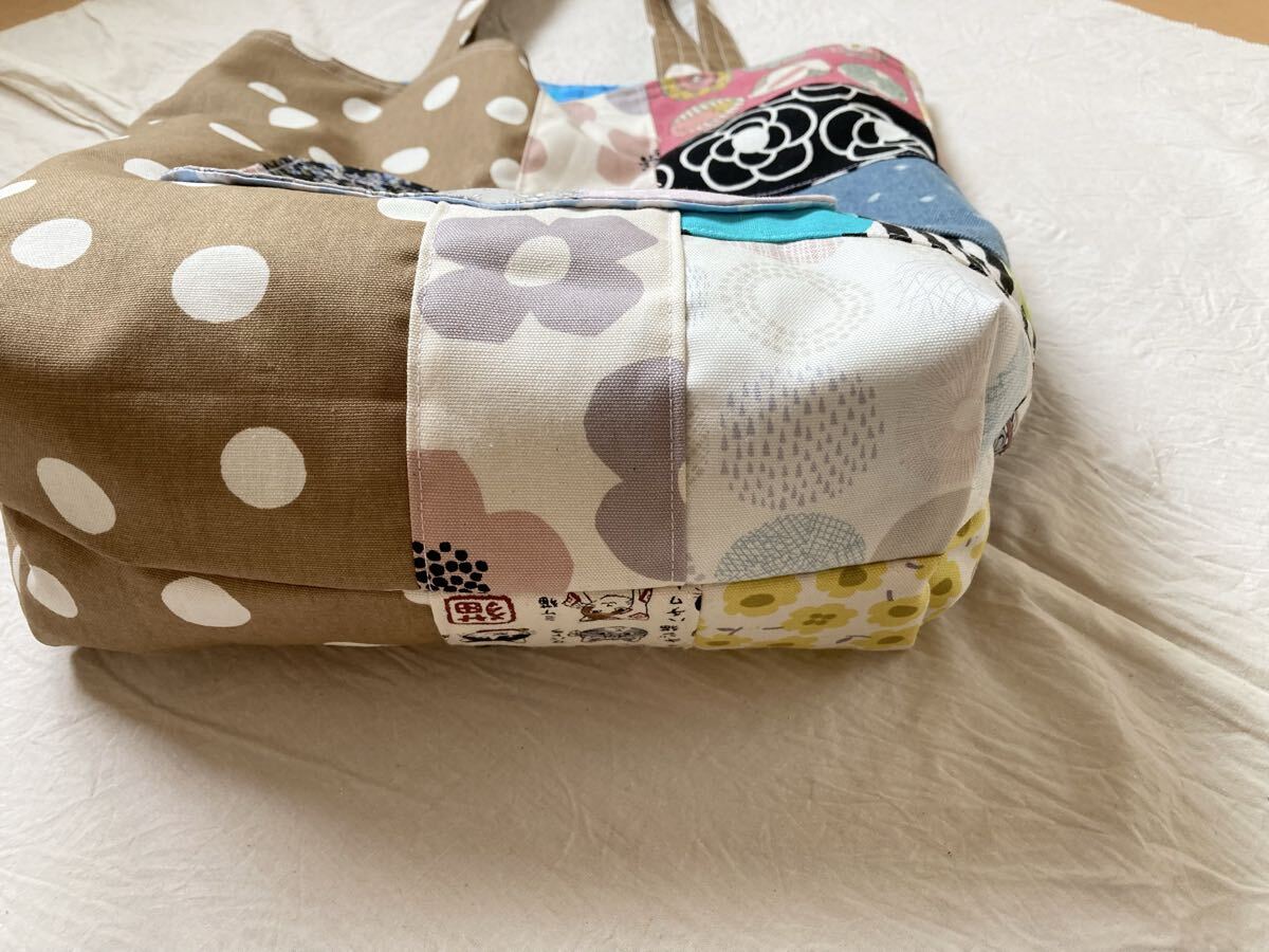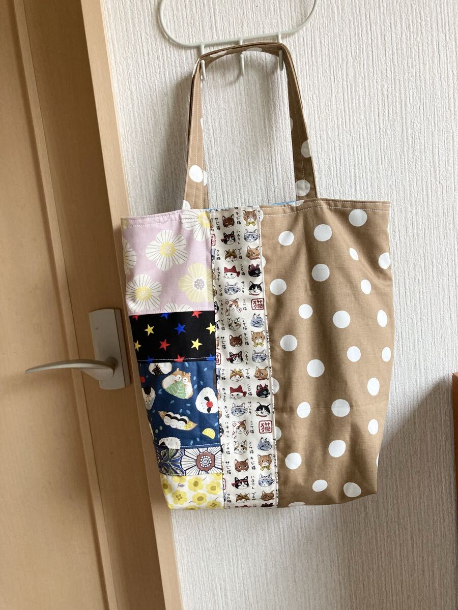 いろいろな生地を組み合わせ作ったトートバッグです。肩掛けできる大きめタイプです。