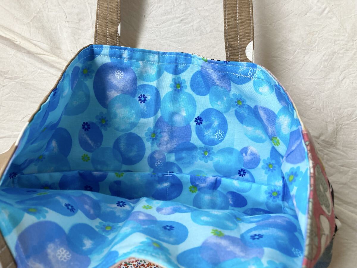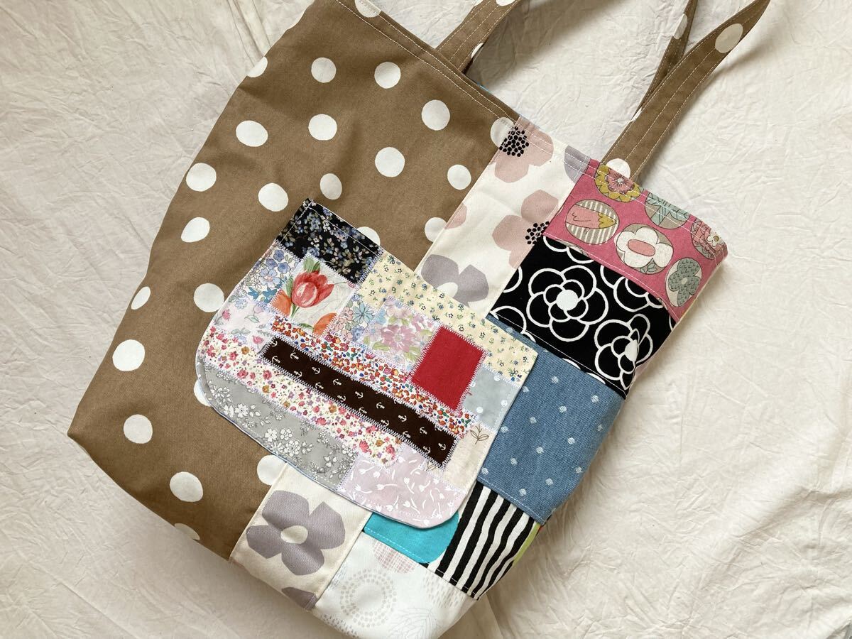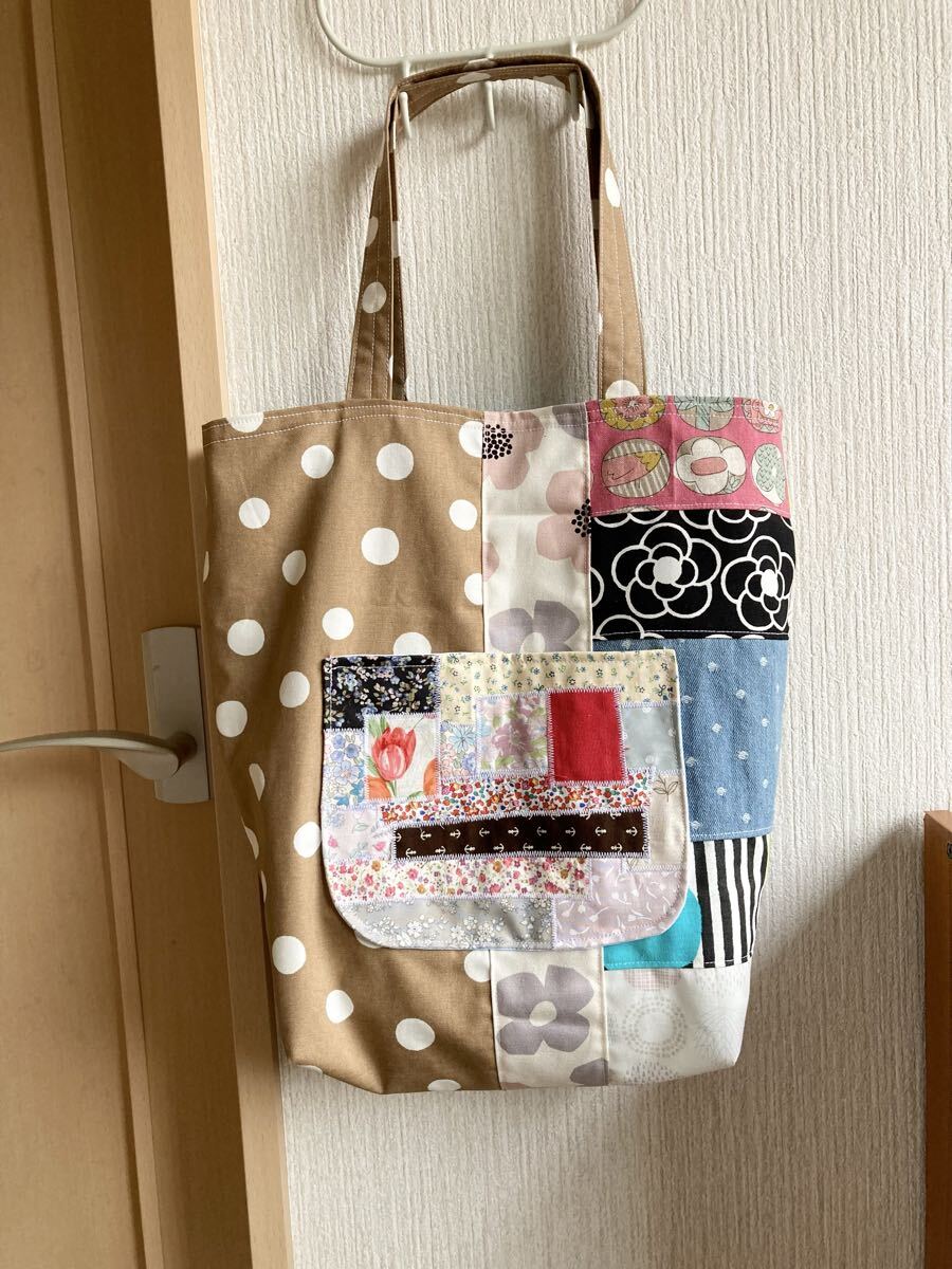 いろいろな生地を組み合わせ作ったトートバッグです。肩掛けできる大きめタイプです。