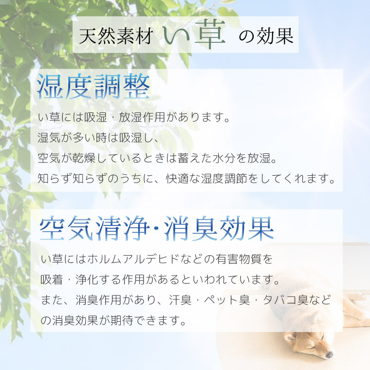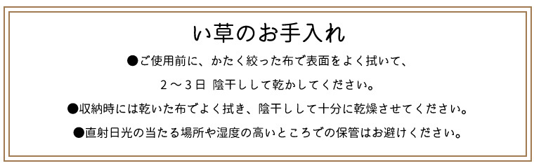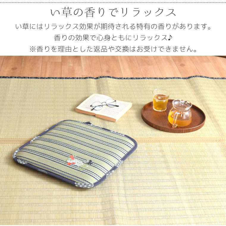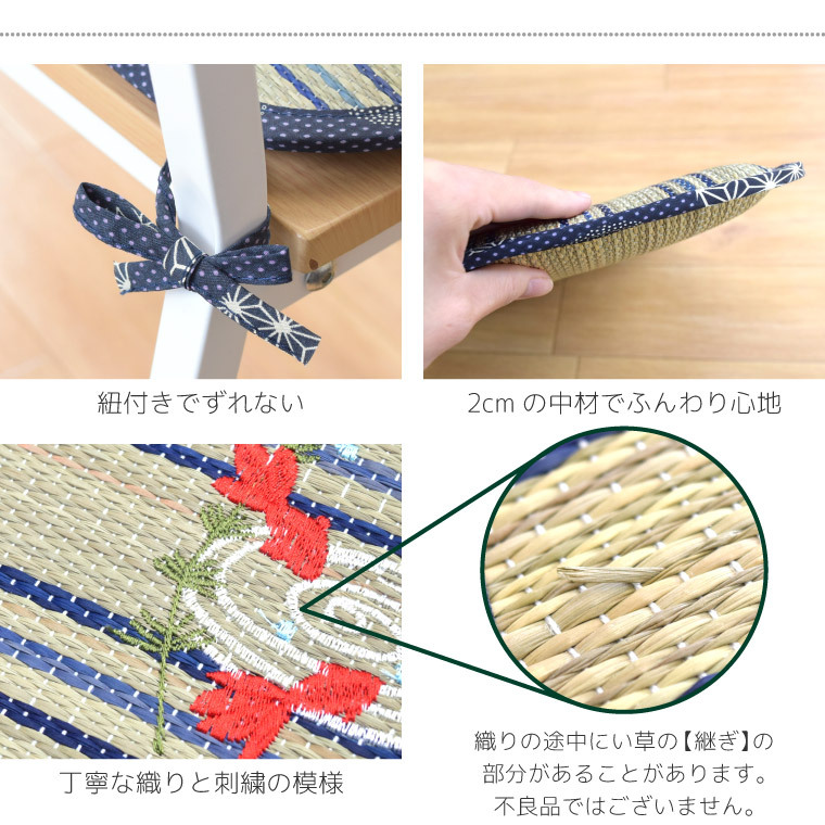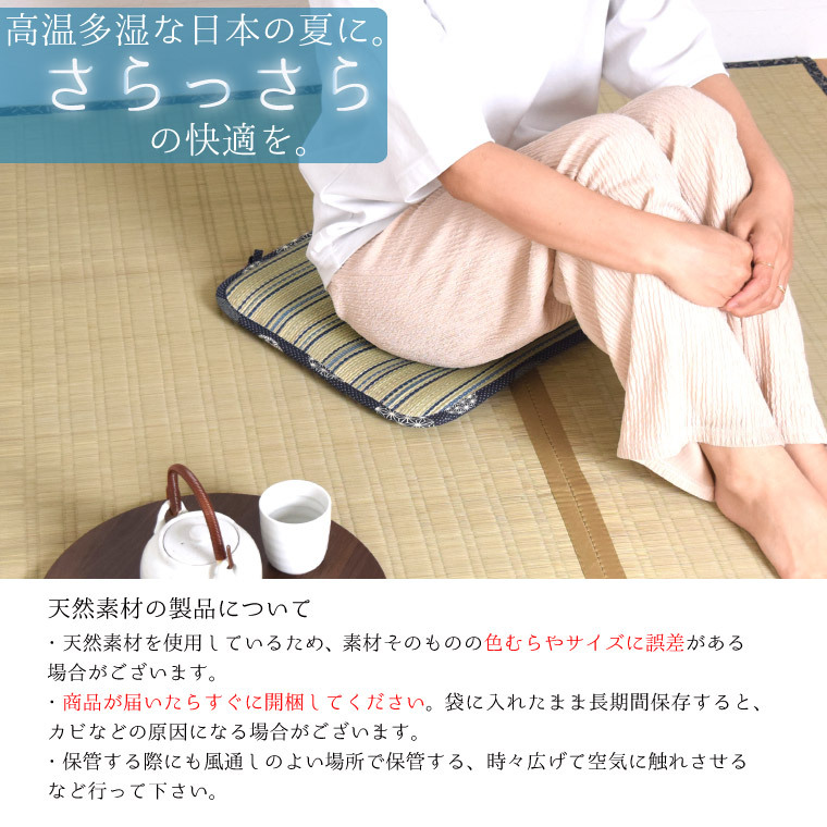 〇仕様 | ・さらりと快適ない草のシートクッション。食卓用の椅子などに敷く座布団として。 |