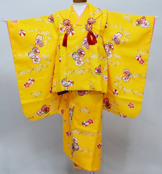 サイズ | ■着物 ・被布丈約48cm ・裄丈約40cm(3.5cmの上げ、7cmのばすことが可能) ・袖丈約57cm ・着物丈約93cm ■草履18cm(フリーサイズ) 適合身長83cm~105cm ※着丈=背中首のゴリゴリ部分から、足くるぶしまでの長さ ※裄丈=腕を斜め45度下げた状態で、背中首ゴリゴリ部分から、肩上を通して、手くるぶしまでの長さ ※身長87cm~96cmであれば特に直さずともこのままでご着用いただけるかと思います ※はじめから肩上げがとられているので解いて数センチ伸ばす(丈出し)ことも可能です。 ※腰上げはとられていないため腰ひもで着付け補正をいただければと思います。 |