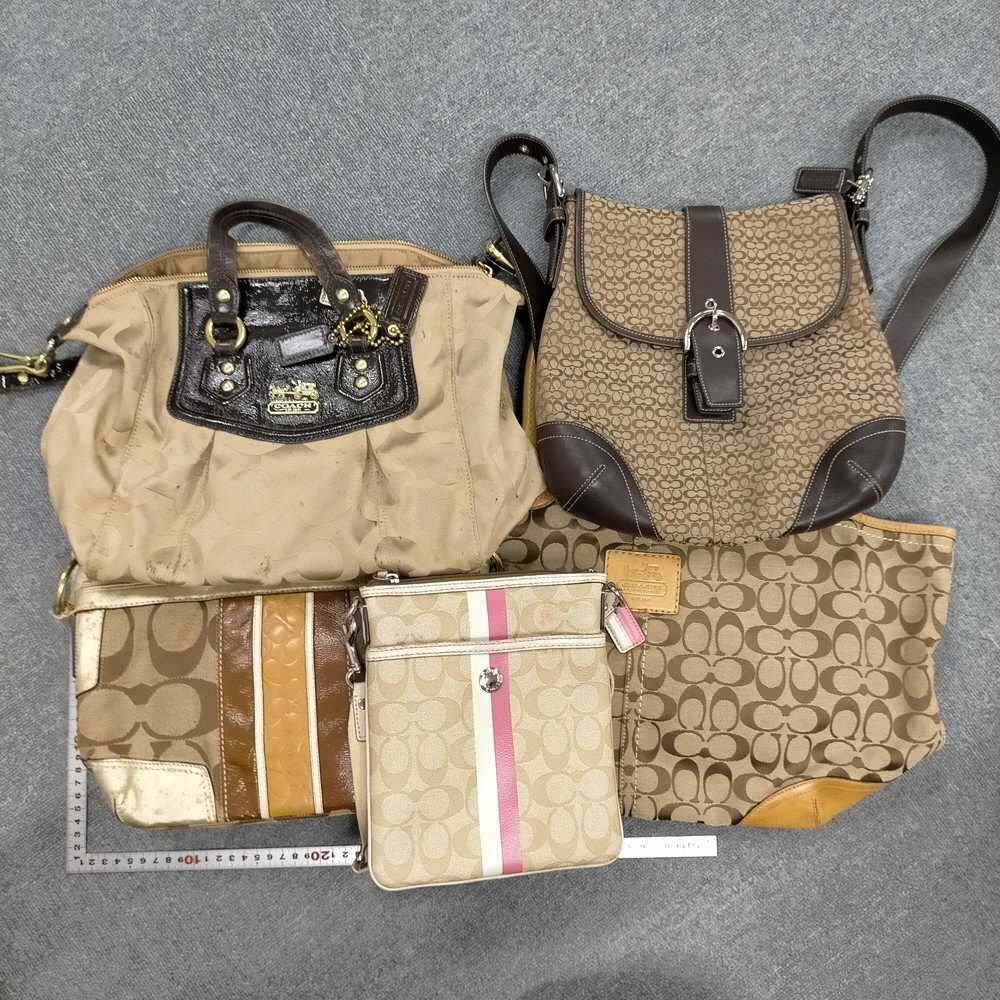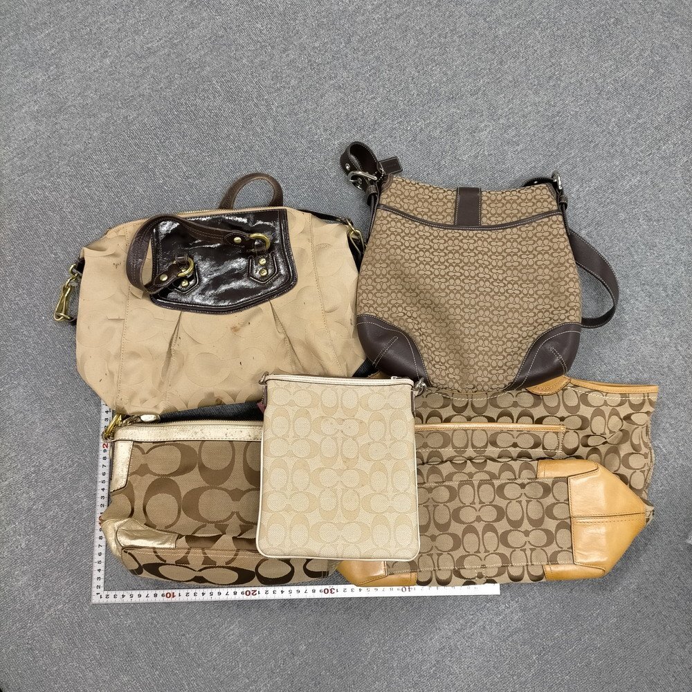 状態備考 : COACHのバッグ5点セットです。シグネチャー柄と無地レザーの組み合わせで、ショルダーやトートなどバリエーション豊富。使用感や多少のスレ・汚れは見られますが、全体的にまだお使いいただける状態です。まとめ売りとしてお得なセットになります。