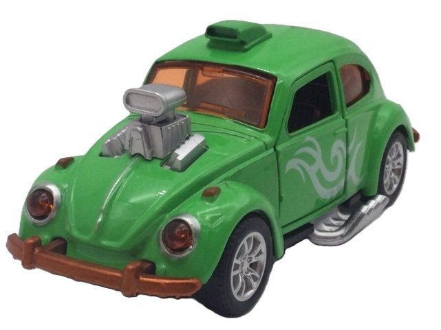 フロントフードから飛び出たV8エンジン、ルーフのエアーインテイク、8本の横出しマフラーを装備したカスタムビートル。まるでホットホイールの世界から飛び出して来たようなプルバックミニカーになります。