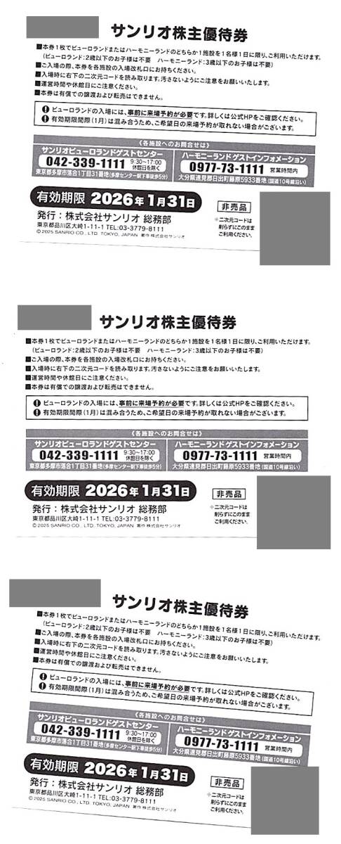 【最新版・送料込み】 サンリオ 株主優待券 3枚 ■ 株主優待 サンリオピューロランド ハーモニーランド
