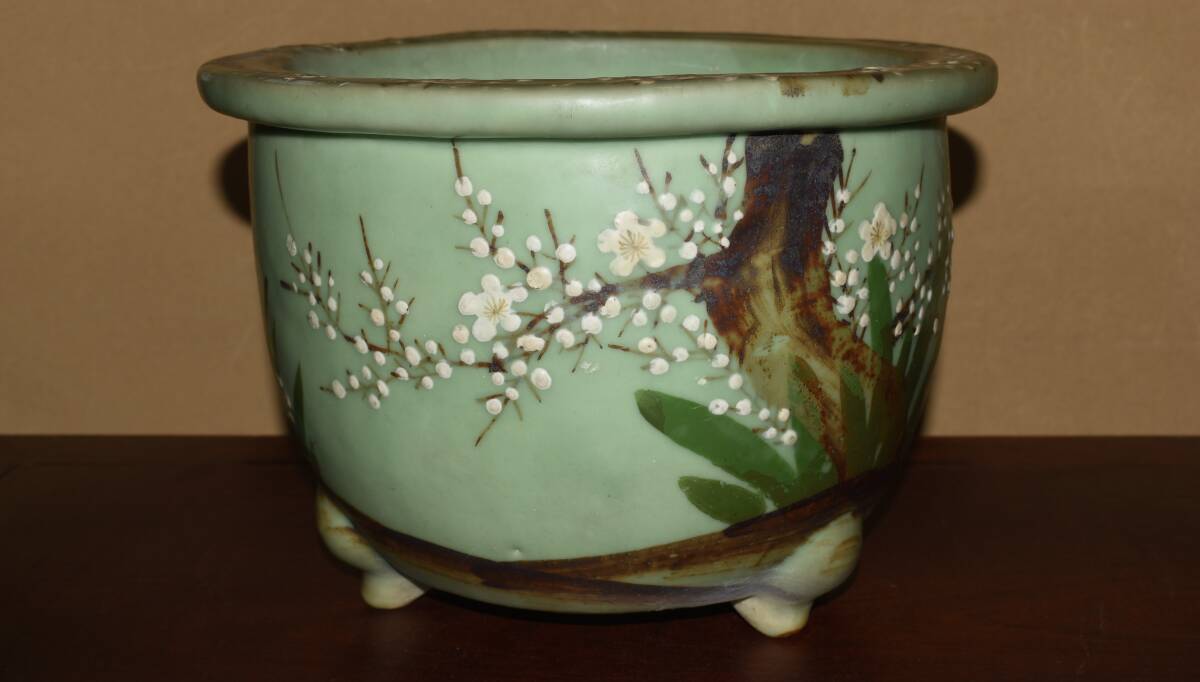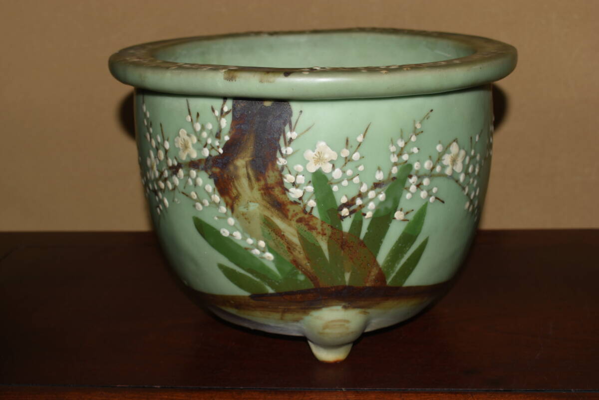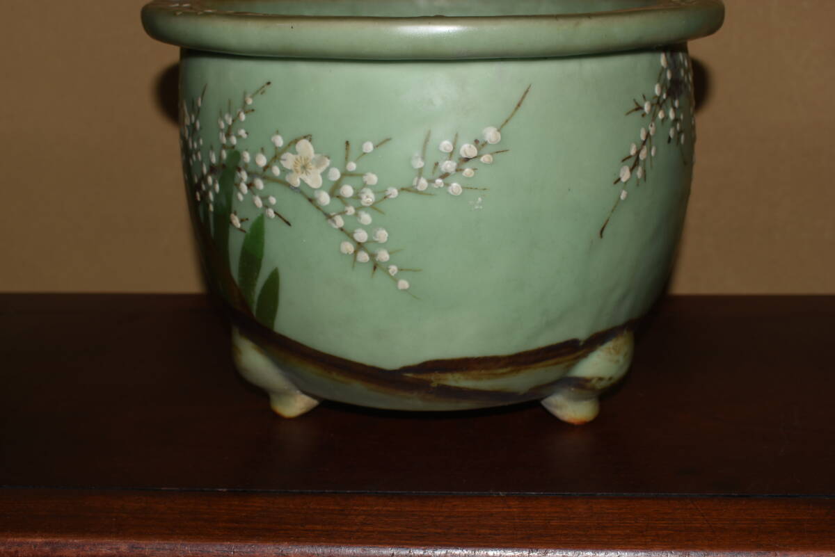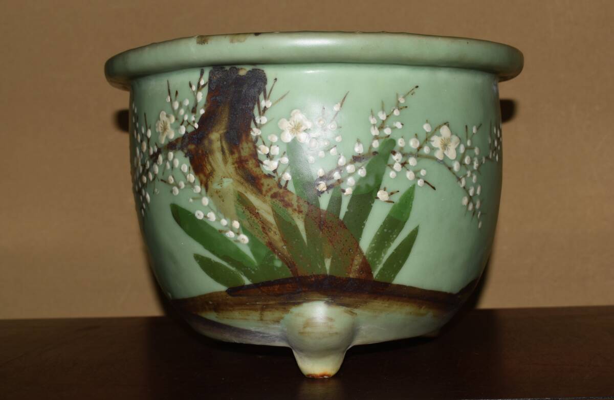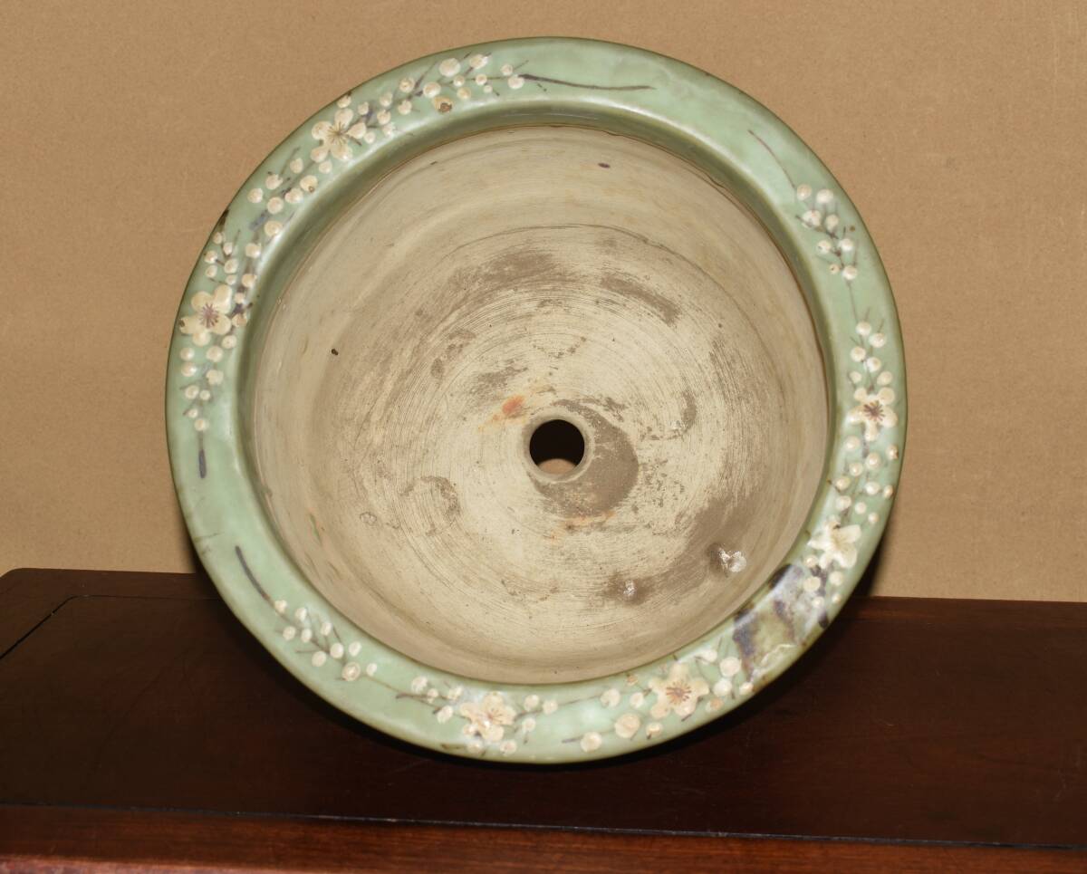 サイズ31,0x22,5cm 人気古窯作家<尾張焼・青磁・色絵梅図・時代乗り抜群・発色抜群・実用性抜群・使い頃サイズ>外縁丸鉢・蘭鉢のご紹介です・・・古窯。時代抜群・・色絵の梅図が繊細に描き込まれ、実用にも優れた素晴らしい逸品です・目立つ傷はありません。・・ 大変古い物ですので縁・足等にホツ・スジ・カケ等がある場合がございます。 状態を良くご確認の上、ご入札宜しくお願い致します。。画像を良くご確認の上、御入札宜しくお願い致します。完品をお求めの方は入札をお控えお願い致します。*注意事項* オークション終了後48時間以内に必ずご連絡をお願いします。ご連絡がない時は、ご購入意思がないと判断し、落札者さま都合のキャンセルとさせて頂きます。再三のご連絡を差し上げても、ご連絡がない場合は、時点繰り上げとさせて頂きます。マイナス評価の多い方や新規の方を削除する場合がありますので、ご了承下さい。また、入札価格が低価格の場合は取消終了とさせて頂く場合がございますので、ご了承願います。古い物等ございますので小さな傷等は、見落とす場合がございますので、写真を良くご覧になり納得の上ご入札して下さい。また、完品をお求めの方は入札をお控えお願い致します。キズ・破損等のご連絡は商品到着5日以内にご連絡ください。それ以降は対応致しかねますので到着後、商品を必ずご確認ください。輸送中の事故(鉢が割れる、枝が折れる等)につきましては商品到着時に確認し取引ナビまたは、お電話にてご連絡下さい。 基本土日の発送は行っておりません。ご了承ください。