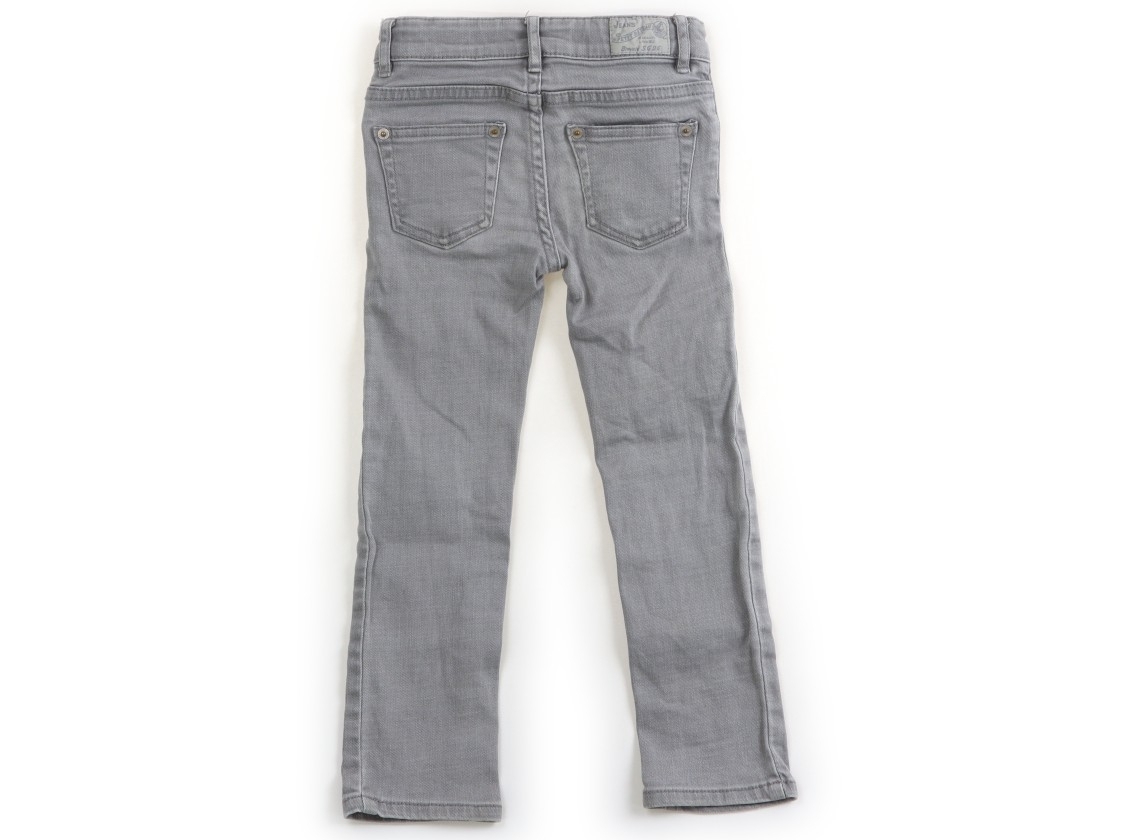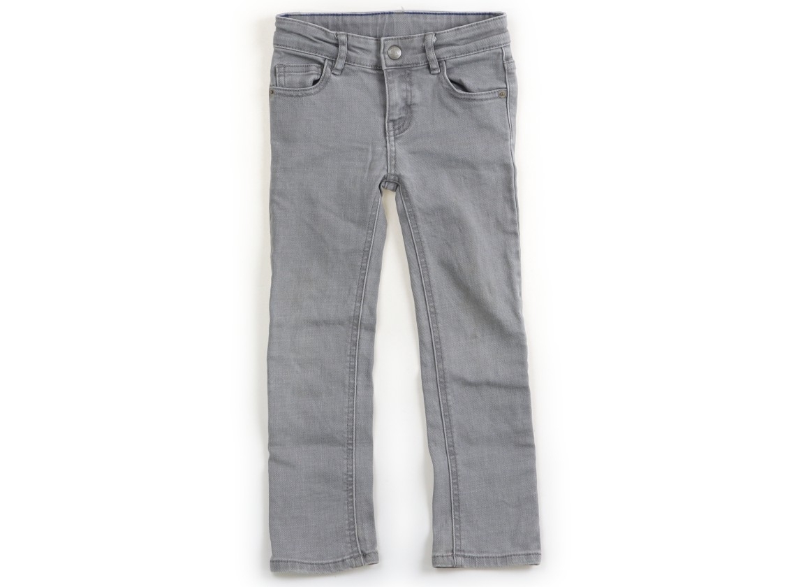 実際のサイズ表記は104cm。デニム。前スナップボタン、ファスナー。ウエストはサイズ調整ゴムが付いています。膝あたりに薄い茶色いシミあり。色褪せと洗いざらし感はありますが、まだまだ普段着として活躍してくれそうです。