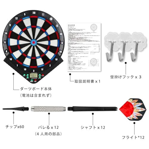 【セット内容と12ヶ月保証期】セット内容:ソフト電子ダーツボード本体、ダーツ ×12 本、フライト ×12 個、交換用チップ ×60、壁掛けフック ×3、日本語取扱説明書 ×1 冊。 ご質問があれば、できるだけ早く弊社までご連絡ください。 お手元に届いてから 12 ヶ月以内に発見された不良品は、無料で交換いたします。