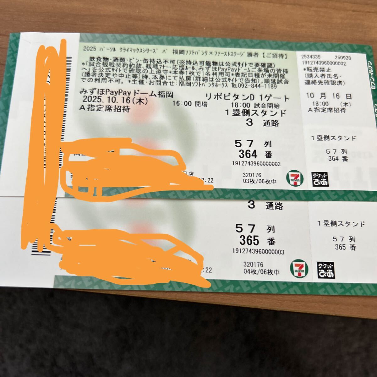チケットは連番で4枚あります。362〜365