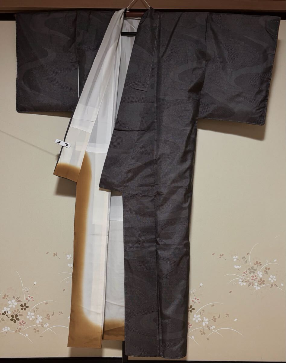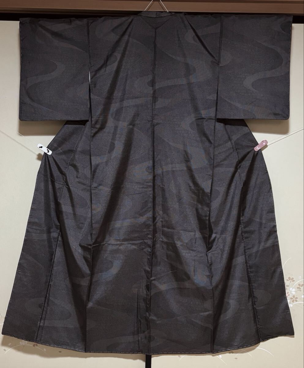 落ち着いた色合いと繊細な模様が上品な江戸小紋のお着物。軽めの生地感で、着心地の良さが感じられる一着です。
