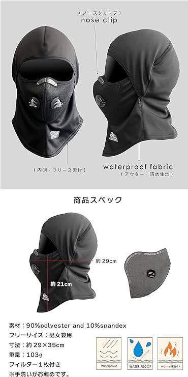 | スポーツなど冬の冷たい雨風から顔全体をガードするフルカバーマスク。 内側は裏起毛になっており保温性に優れて暖かく肌ざわりが良い。 外側は防風・防水機能に優れた生地を使用し真冬でも快適に。 自転車のサイクリングやバイクなどの通勤通学や、釣り、登山、スノボー、スキーなどの ウィンタースポーツにも! フィルター付きで花粉・飛沫、粉塵をブロックしマスク代わりにも。 [ノーズクリップ] 調整可能なノーズクリップは、メガネやサングラスの曇りを防ぎ、マスクがずれたり滑らないようにします。 調整可能なので様々な人にアジャスト。 [呼吸弁付き] 逆止弁バルブで呼吸もしやすい。 呼吸の排出時にバルブが開いて一気に排出。 取り込む時にはバルブが閉じてフィルターを通して空気を取り込める。 長時間使用も苦しくない。 [防風・防水] 外側の生地には防風性に優れたライクラ生地を使用しているので冷たい風もしっかりとブロックします。 首部分も長めの設計しているので首の下部までしっかりと覆います。 [保温性] 内側は裏起毛素材で保温性に優れています。 またフリース素材は肌ざわりが良く長時間の着用もストレスを感じません。 [バラクラバ] 真冬にはとっても活躍するフルフェイスマスク。 ヘルメットやキャップのしたに着用する事もできます。 またサイクリングやスノボー、バイク、釣り、キャンプなどの様々なスポーツでも大活躍。 寒さや、埃、紫外線などの対策に。 商品内容冬用フルフェイスバラクラバ 素材90%polyester and 10%spandex フリーサイズ男女兼用 寸法約29×35cm 重量103g ※ジャンク品の為、正常に動作しない場合や修理が必要な場合等ございます。キズ、汚れ、破損、付属品が足りない等ある場合がございます。ノークレーム、ノーリターン | |