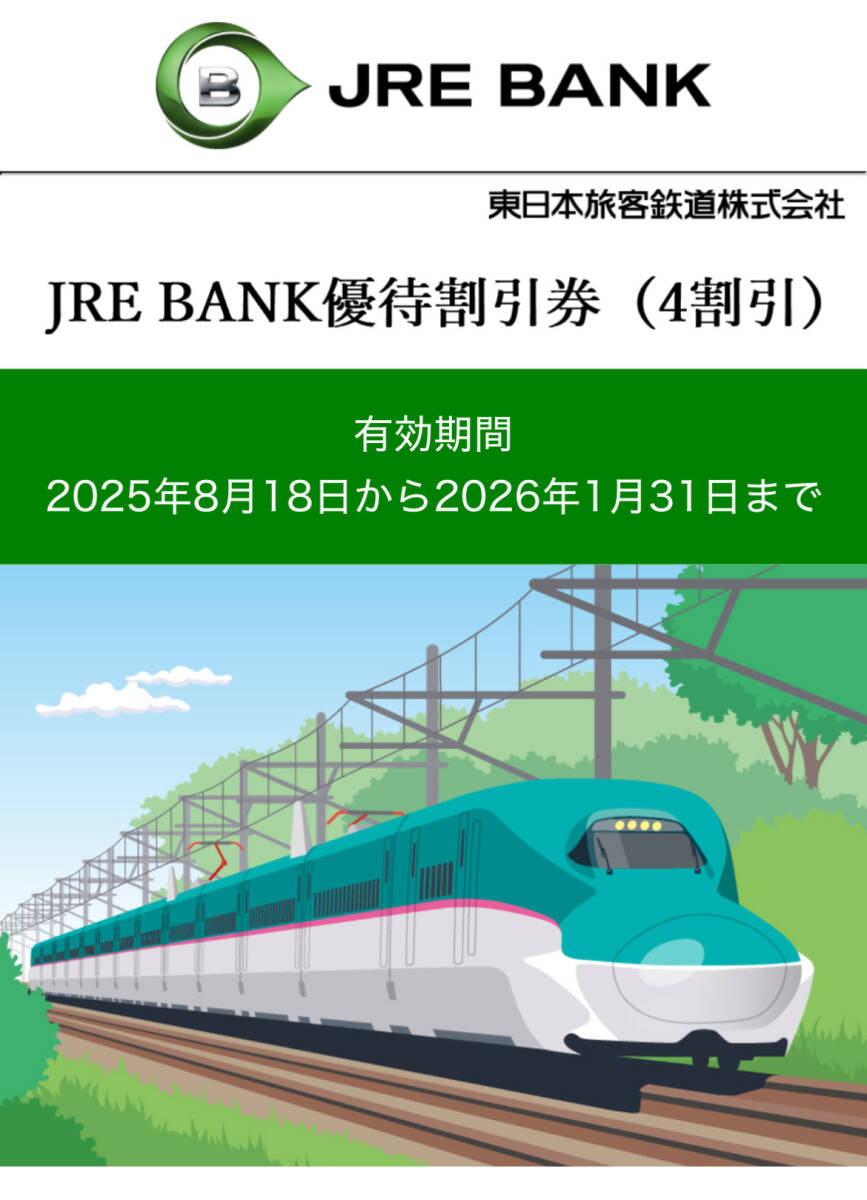 ・ 「JRE BANK優待割引券(4割引)」のご利用は「えきねっと」からのお申込みとなります。