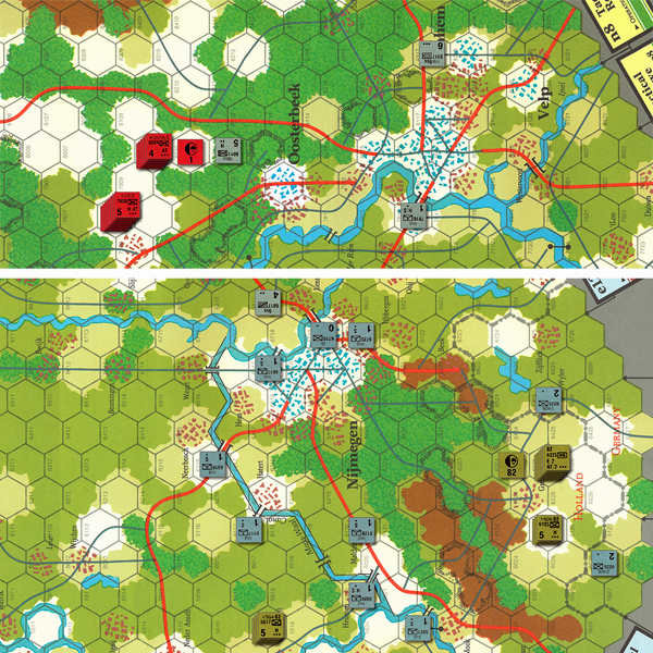 両軍共に軍単位で補給を管理し、司令部から工兵機能や対戦車攻撃能力等を指揮下ユニットに与えます。 ユニットは戦闘モードか行軍モードがあり、行軍モードの機械化ユニットは移動力が無制限になります。 また、重火器を有するかどうかによってそのユニットが及ぼす制圧ヘクスが強制圧なのか弱制圧なのかかが決まります。