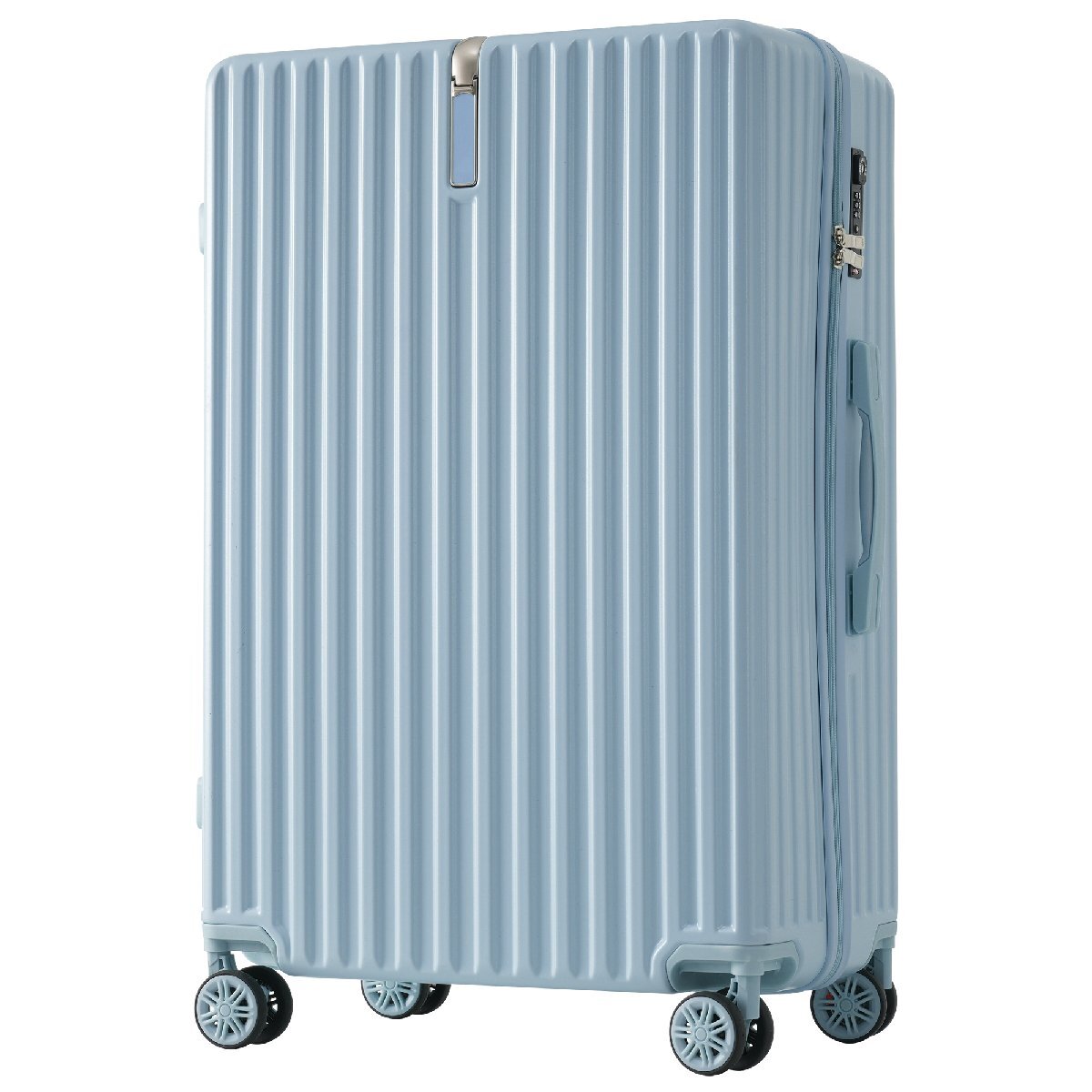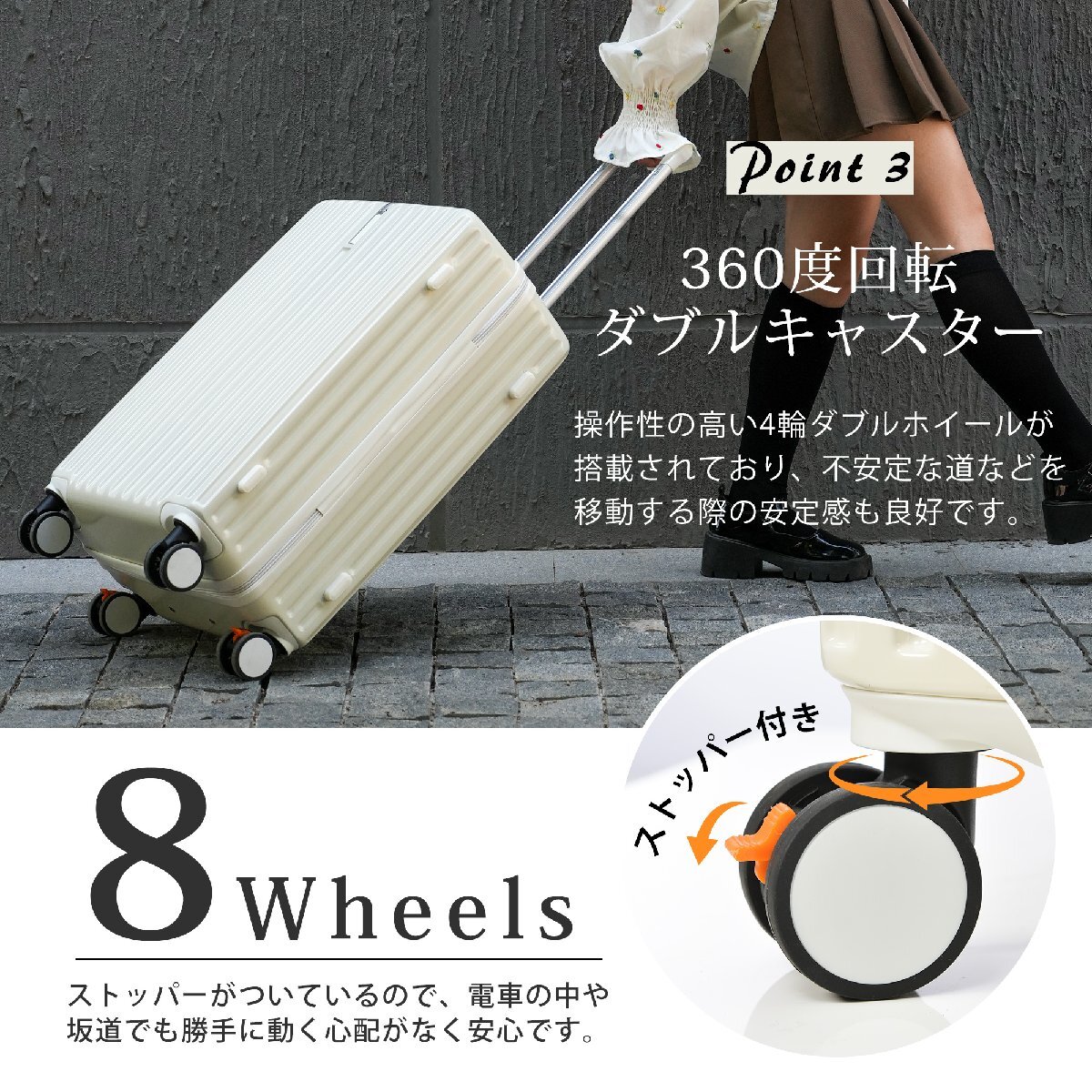 【360度回転 ストッパー付き ダブルキャスター】360°独立に回転できるダブルキャスターが搭載し、海外に多い石畳やレンガ道でも滑らかに動かすことができます。8つの車輪に荷重が分散されるため耐久性にもすぐれています。また、 ストッパー機能を備えたデザイン、電車の中や坂道でも勝手に動く心配がなく安心です。安定した走行が可能なスーツケースです。