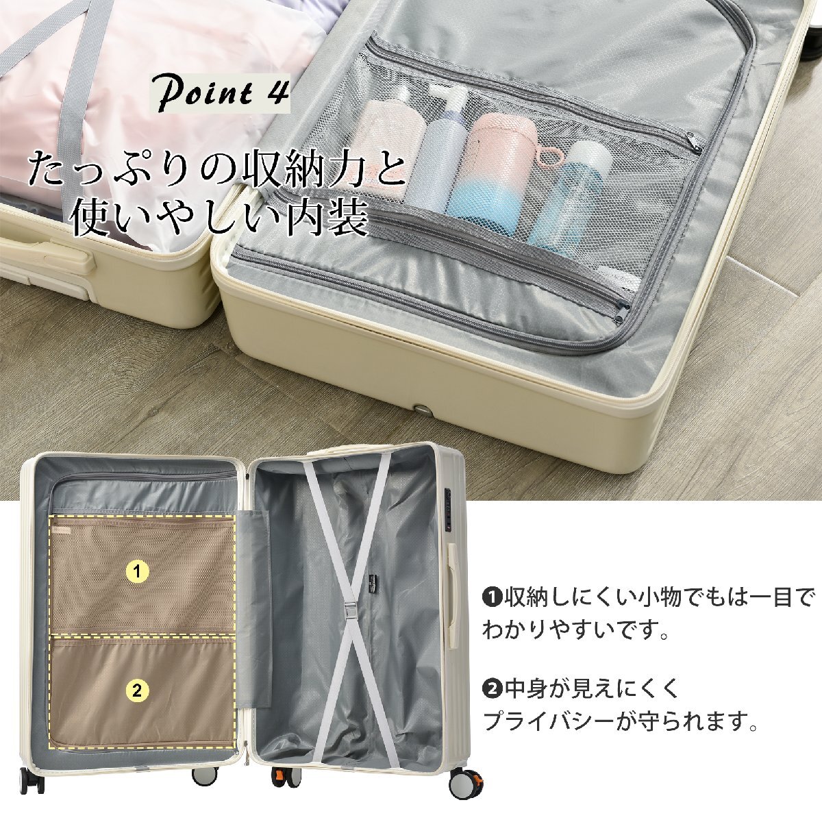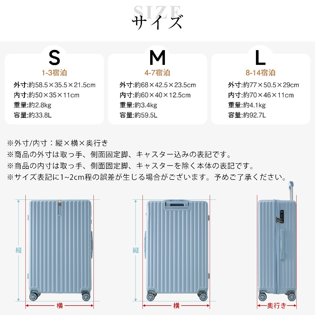 【商品仕様】※S size:外寸:約35.5×21×58.5cm 内寸:約35×11×50cm 本体重量:約2.8KG 、1~3泊に似合い。※M size:外寸:約42.5×23.5×68cm 内寸:約40×12.5×60cm 本体重量:約3.4KG、4~7泊に似合い 。※L size:外寸:約50.5×29×77cm 内寸:約46×11×70cm 本体重量:約4.1KG 7泊以上。