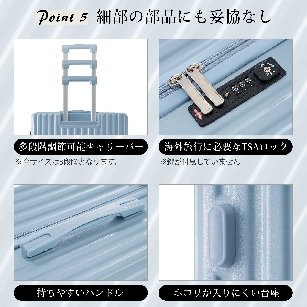 【TSAロック・多段階キャリーバー】スーツケースは海外旅行には欠かせない世界基準のダイヤル方式のTSAロックを採用しています、国内外にも関わらず、航空便をご利用する際に便利で、より安全です。それに暗証番号式だから使いやすい。※TSAロックの鍵は税関検査のスタッフが持つマスターキーですので、付属しておりません。高さ3段階調節、スーツケースは身長や状況に応じて自由に長さを調節でき、持ち運びもラクラクです。