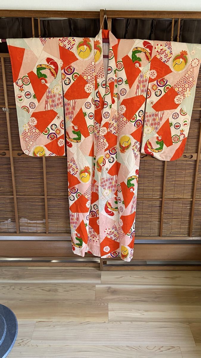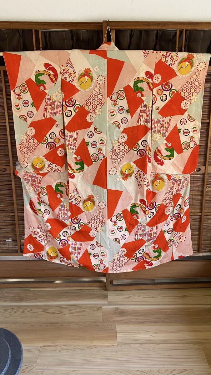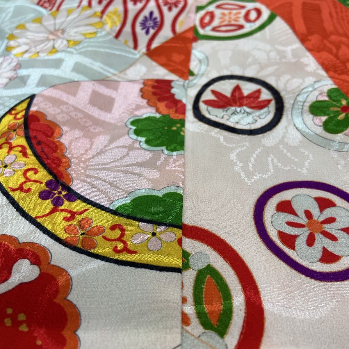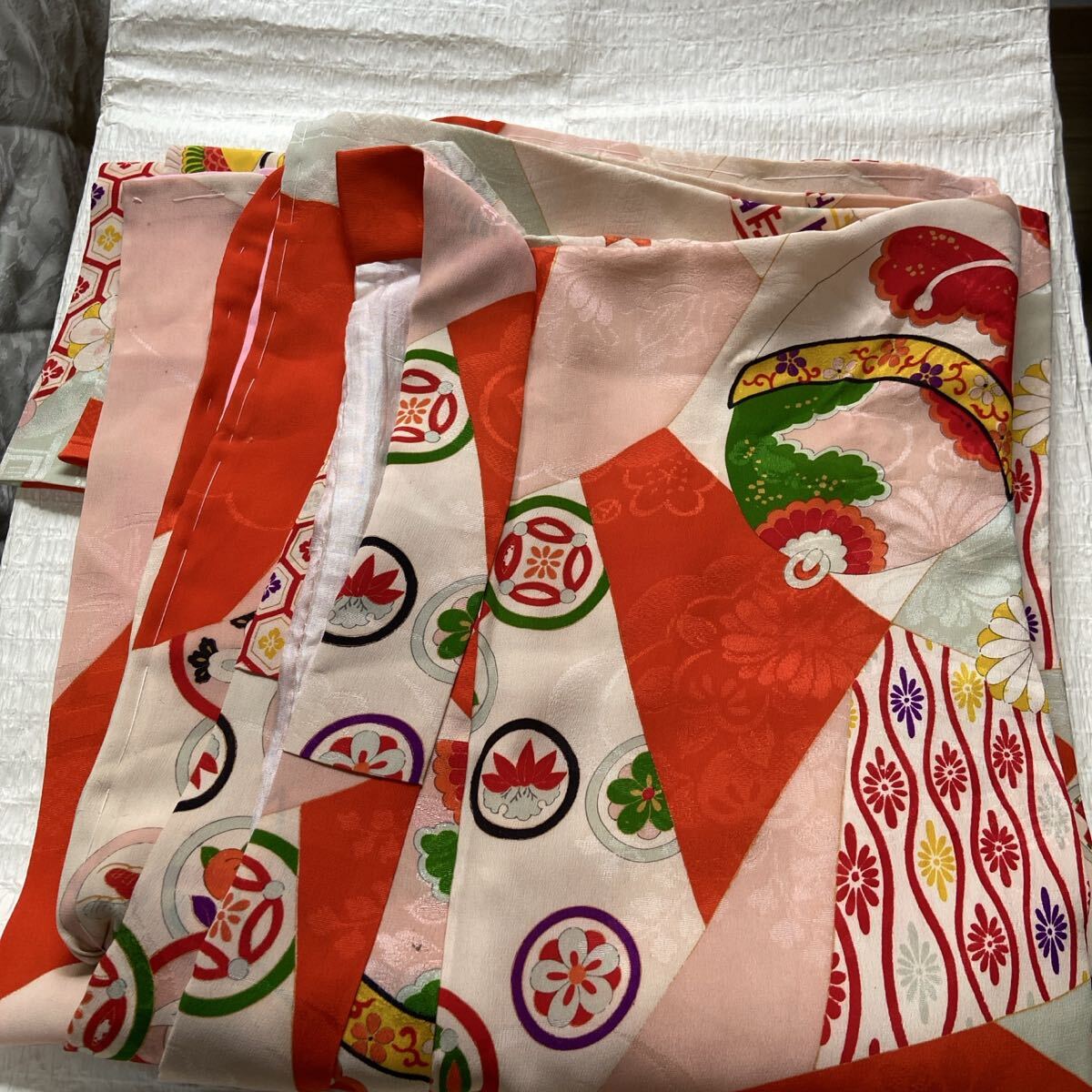 七五三の祝い事にぴったりな赤とクリーム色の華やかな着物。