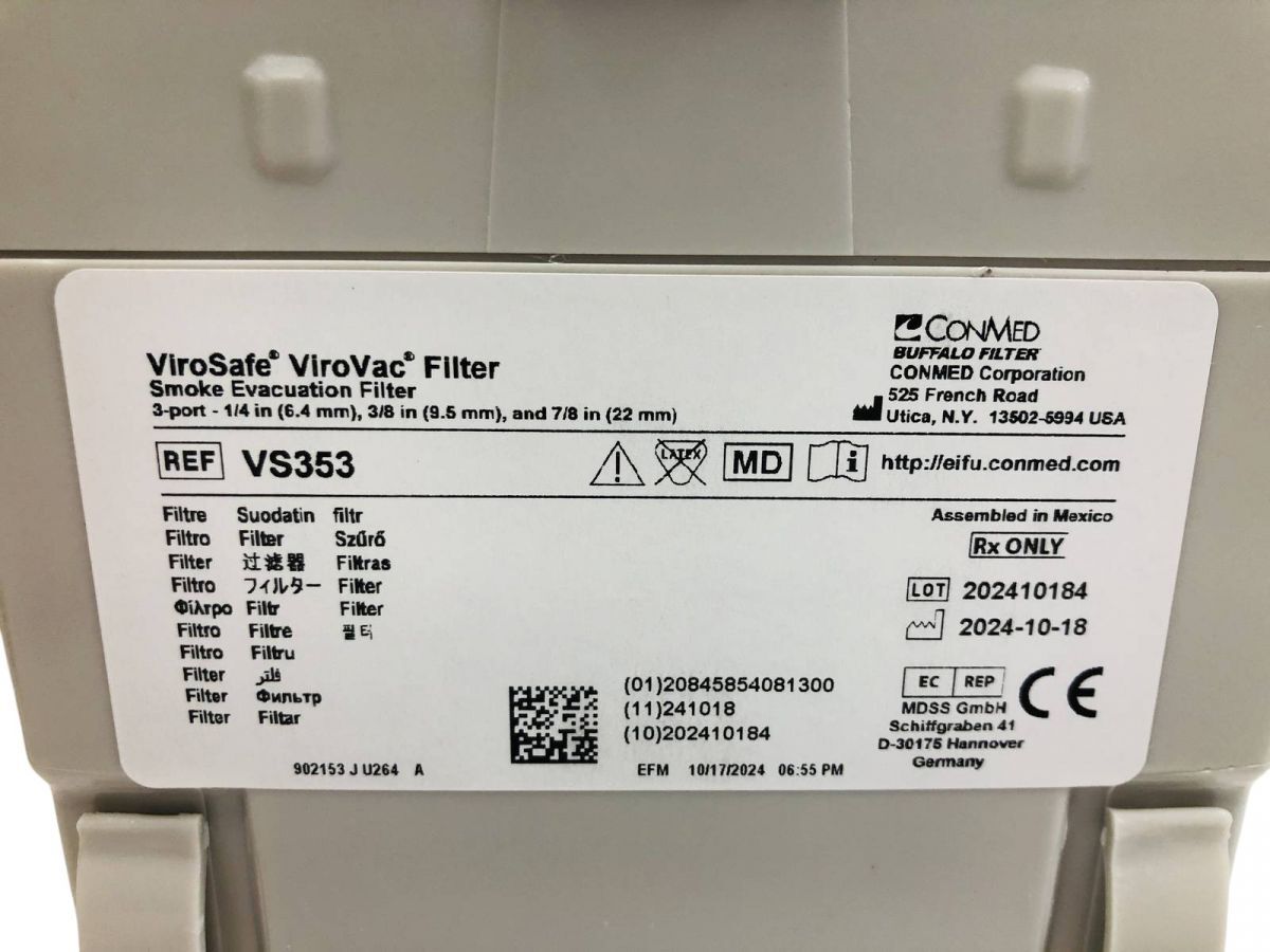 特徴 4層フィルター構造(プレフィルター、ULPAフィルター、活性炭、ポストフィルター)により微小なウィルスもしっかり拿捕します。 仕様 3ポートフィルター(6.4/9.5/22mm) 性能 0.1~0.2μmの粒子を99.999%除去 フィルター寿命 最長35時間 | ||||||||||||||||||||