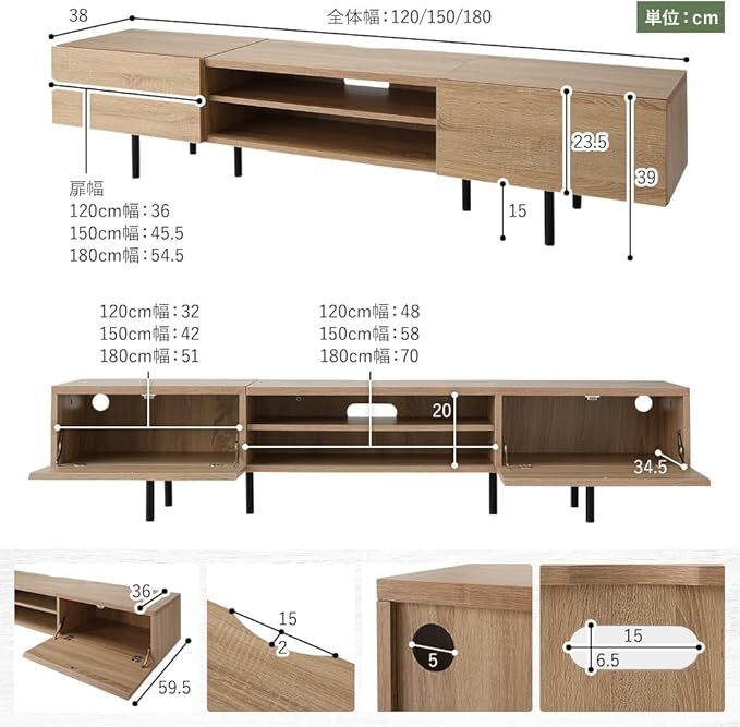 ご覧いただきましてありがとうございます。 今回出品いたします商品はこちらです。 「 2510051 新品 未使用品 RASIK 異素材 MIXワイド テレビボード sotova ストーヴァ 幅180㎝ ナチュラル 」 サイズ(仕上がり寸法) 全体(外寸):幅約180㎝×奥行約38㎝×高さ約39㎝(脚約15㎝) 左右扉(内寸):幅約51㎝×奥行約34.5㎝×高さ約20㎝ 中央扉(内寸):幅約70㎝×奥行約34.5㎝×高さ約20㎝ 重量:約29㎏ 耐荷重:天板約50㎏ 棚板約8㎏ 材質:本体:プリント紙化粧パーティクルボード(ブラック ブラウン ナチュラル:3Dシート貼り) 脚:スチール ※外箱サイズの寸法を計測し、おてがる180㎝でお送りします。 詳細は画像のほうでよくご確認ください。 付属品などは写真にあるものが全てとなります。 ご了承くださいませ。 どうぞこの機会にぜひ購入をご検討ください。 他にも多数出品しています。 ぜひ下記バナーからご覧ください。 | |||
