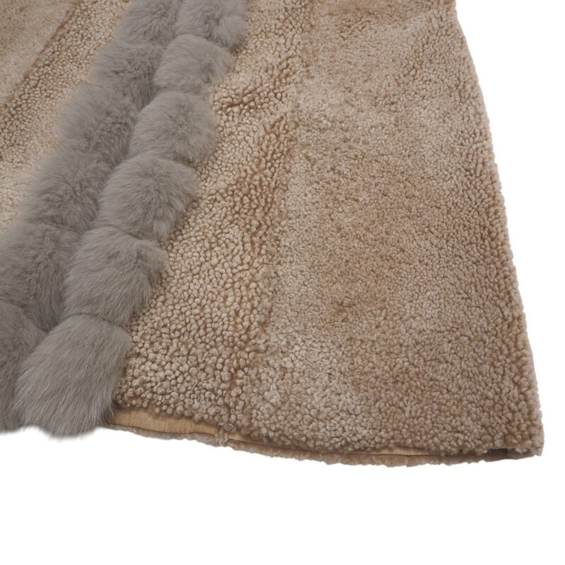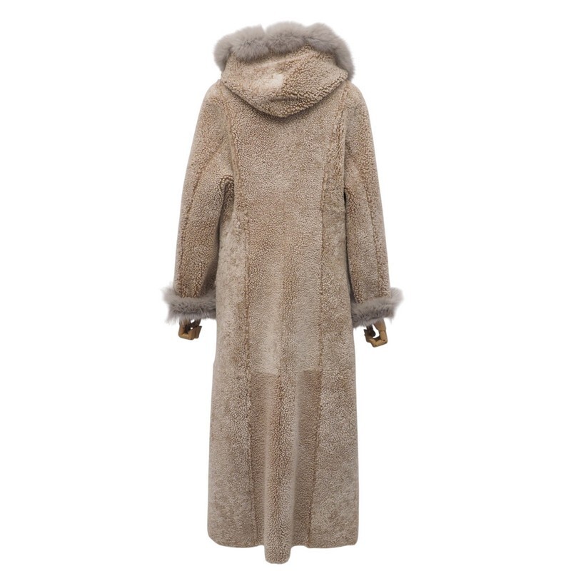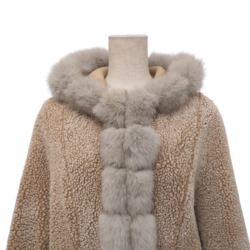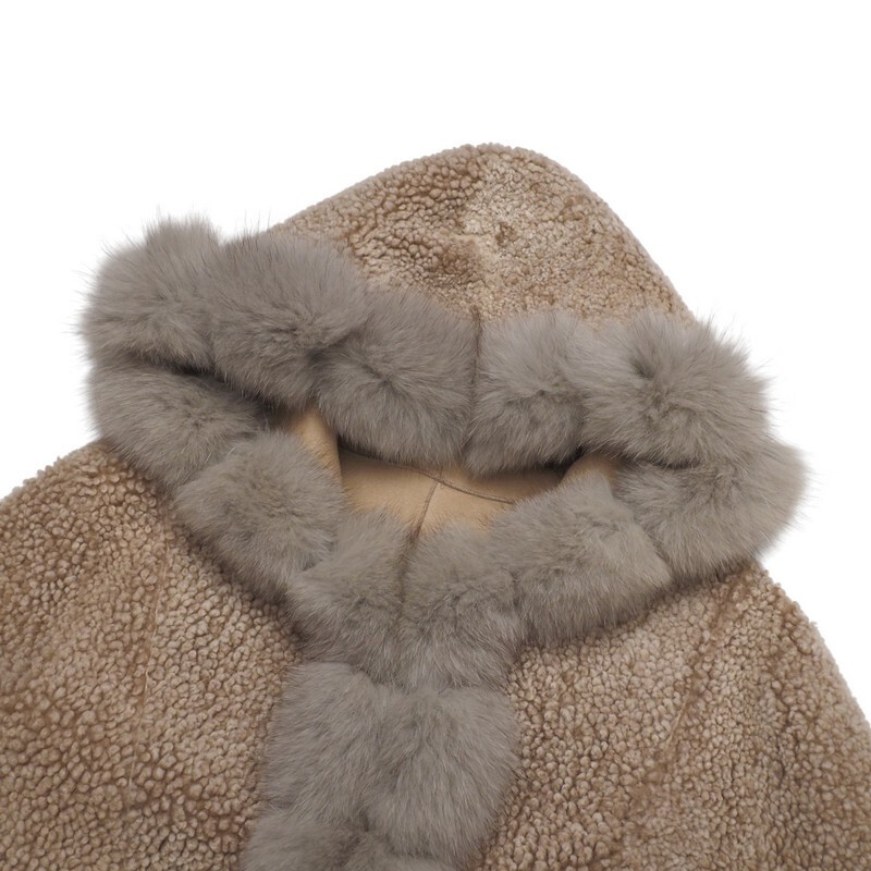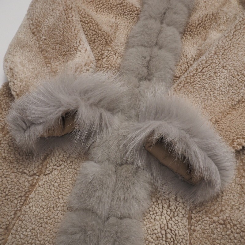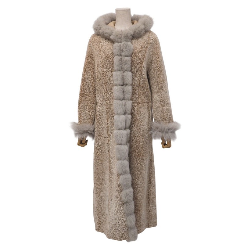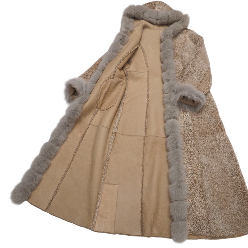GS2987=ムートンコート*スペイン産ラム*Pieno Di Grazia*フォックスファートリム*ロングコート*フード付き*サイズF*ベージュ系 | |||