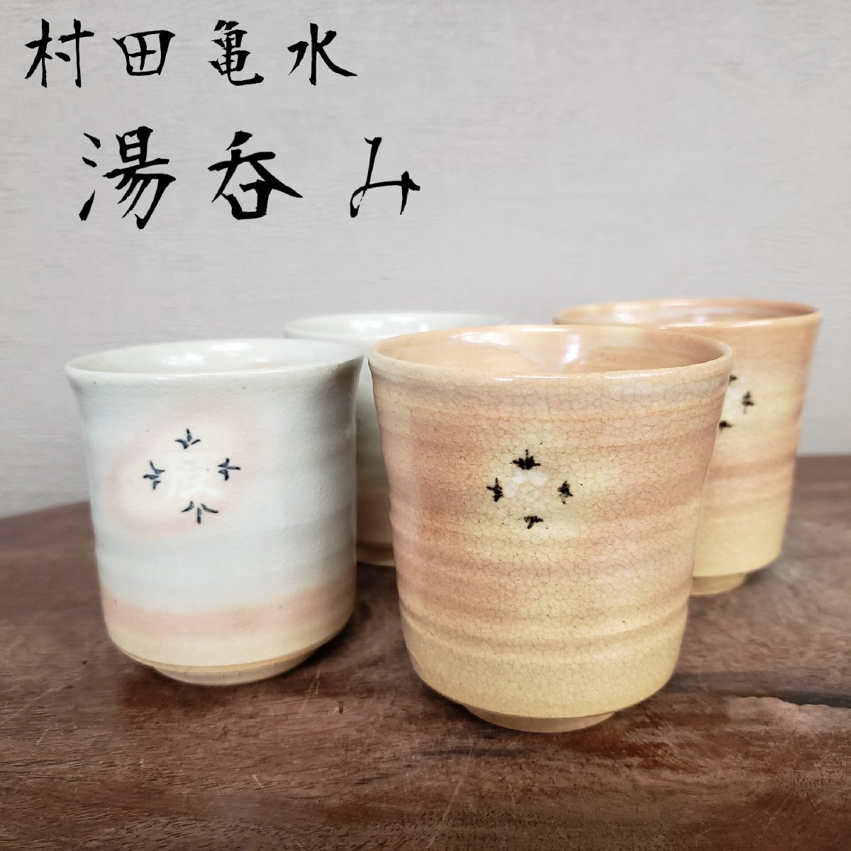 古い亀水作の湯呑み4客です。外箱はありません。経年による汚れ、擦れ、貫入があります。
