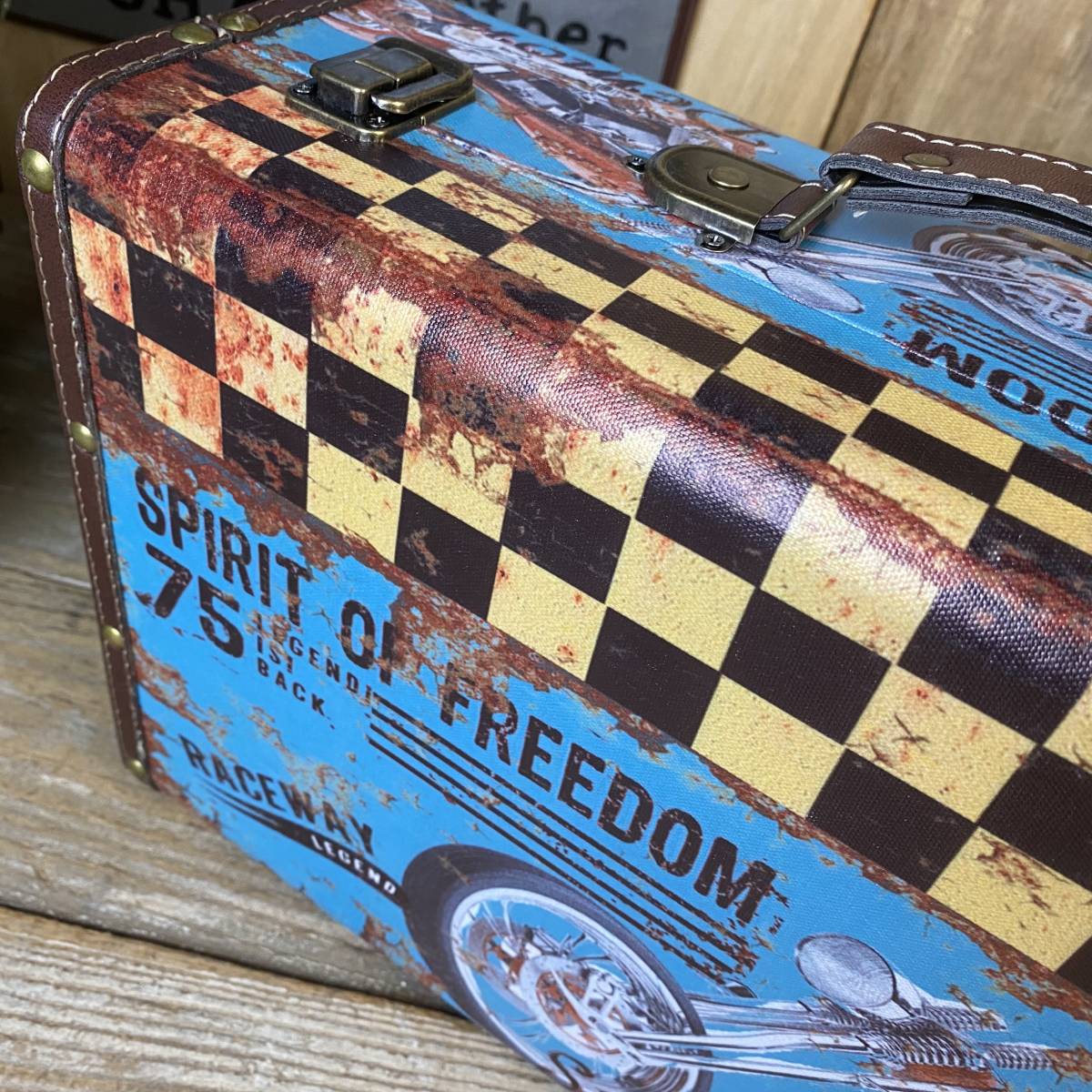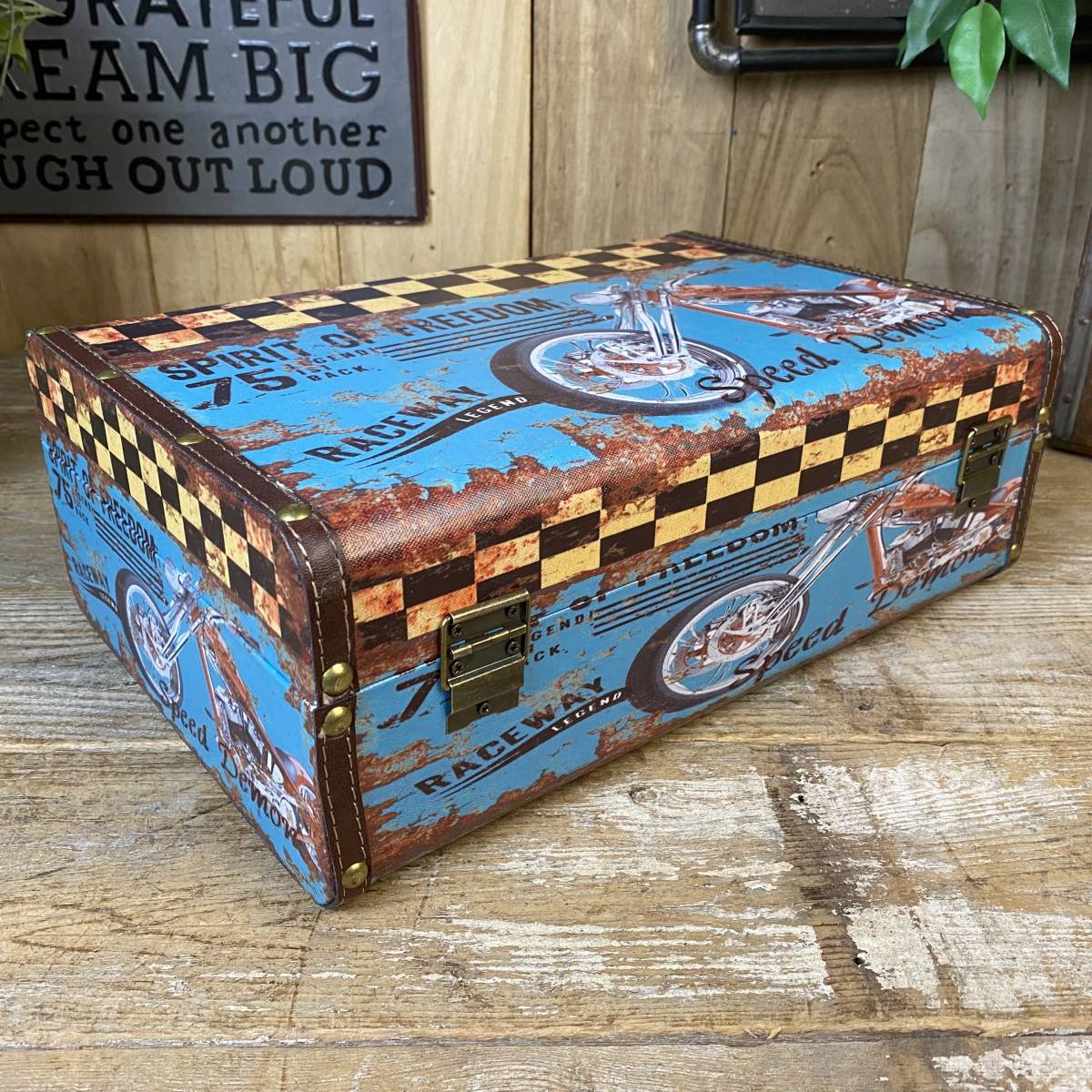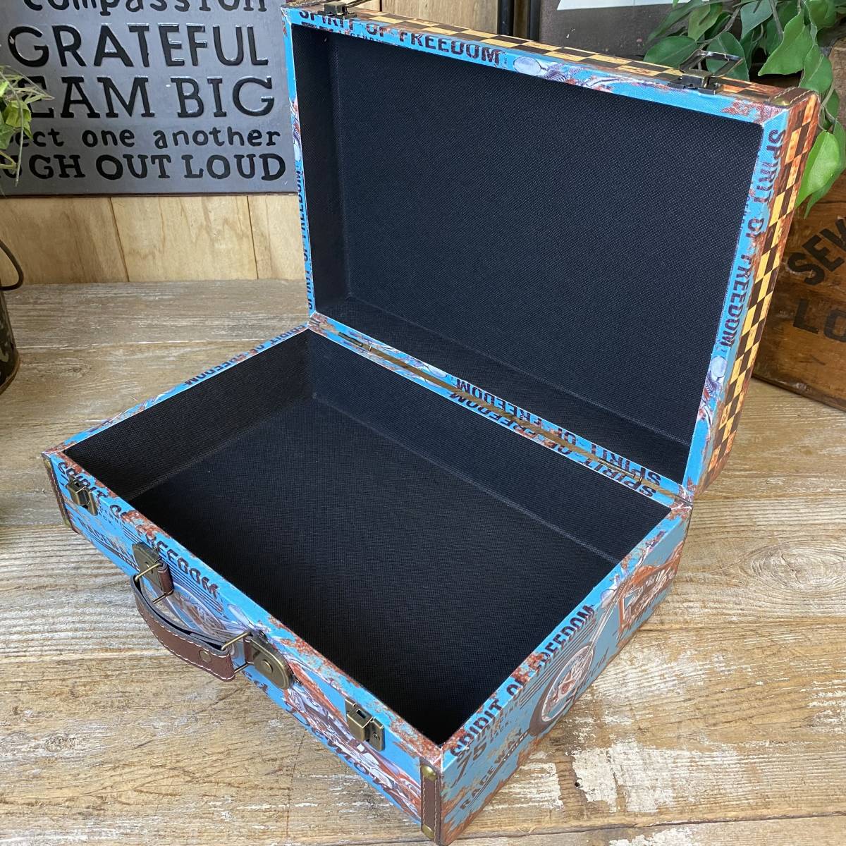 ◆◇商品詳細◇◆ トランク型ケース小 アンティークデザインのトランク型レザーケースです。小物収納に最適なおしゃれなデザインです。今大注目の男前インテリアにぴったりなお品です♪インテリア小物としてもお部屋の雰囲気アップに役立ちそうですね。アンティーク調柄なのでヴィンテージの風合いもお楽しみいただけます。花器としてもオシャレな品で、観葉植物などを飾っても素敵です!お部屋の整理整頓にも役立ちますよ!持ち運び用トランクケースにはもちろん、ショップのディスプレイにも合わせやすいですよ。鍵フック付でしっかりした作りですので書類ケースやトランクケースにもお使いいただけそうです!アンティーク調家具雑貨が送料無料のこの価格!ほかでは買えないこの機会にぜひ! 【商品状態説明】 美品。 【サイズ】 横幅:38㎝ 奥行:27㎝ 高さ:13.5㎝ ■収納部分内寸 横幅:36㎝ 奥行:24㎝ 高さ:7㎝ 【素材】 本体:ウッド(MDF) 表面:合成ビニールレザー 【カラー】 ブルー 【参考価格】 ¥5,000 | ◆◇発送方法◇◆ ●送料は基本無料ですが、沖縄・離島などにお住まいの方はご負担ください。 (沖縄・離島の方はメールにてご連絡いただければ、送料をお知らせいたします。) ●ヤマト運輸・佐川急便・第一貨物のいずれかにて配送いたします。 (運送会社の指定はできません。ご了承ください。) ●日時・時間指定のある方や、お問い合わせ(追跡)番号をご希望の方は取引連絡の際にお知らせください。 | |
