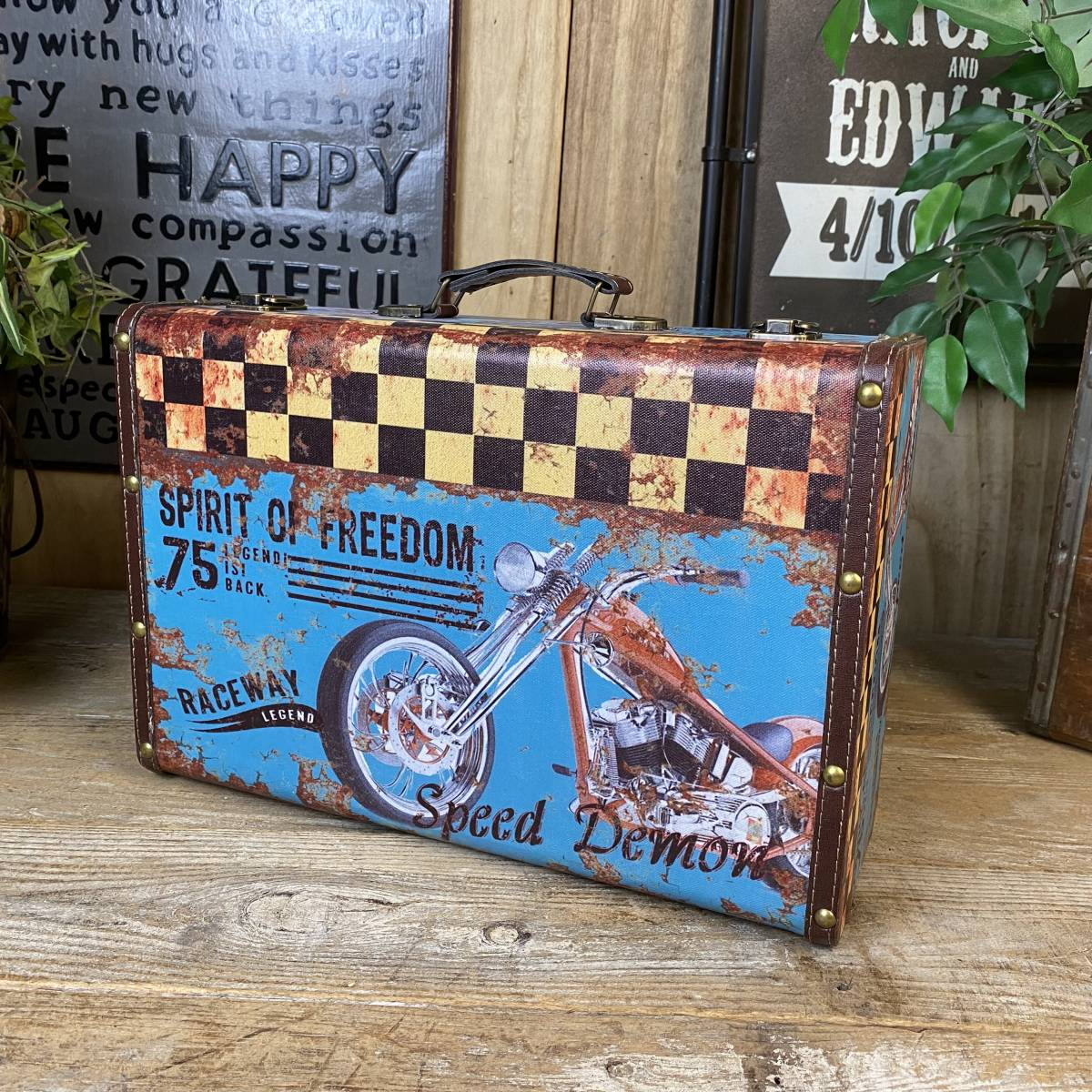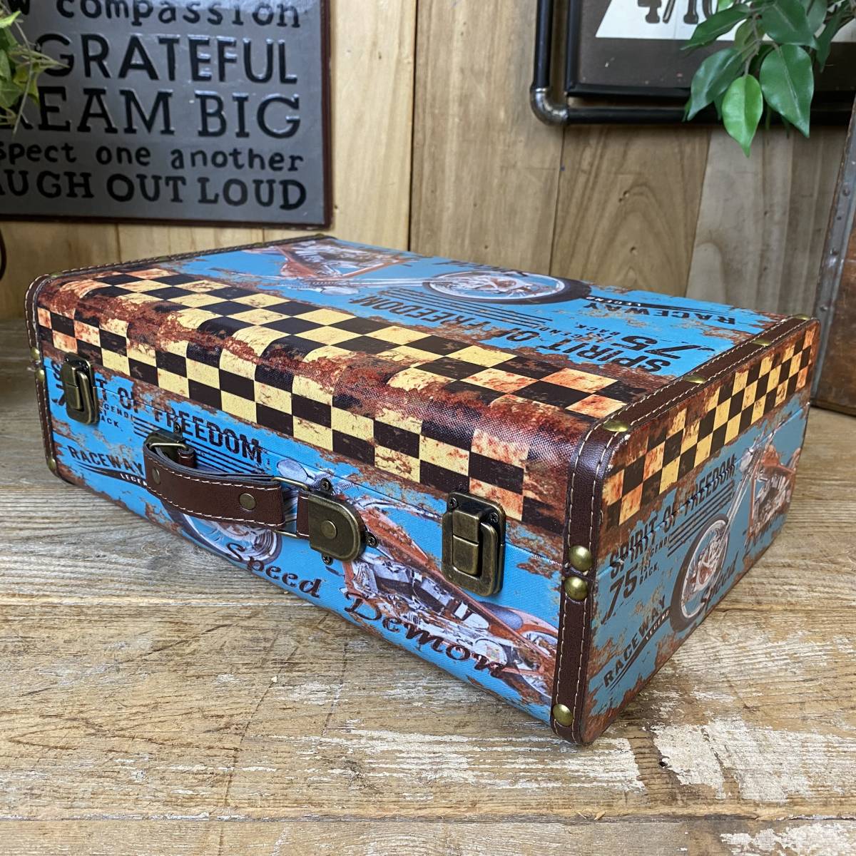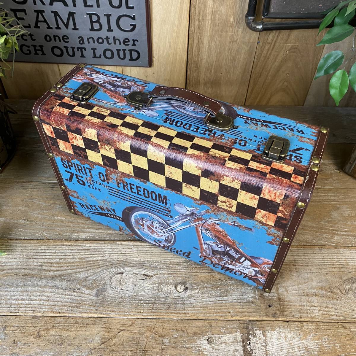 ◆◇商品詳細◇◆ トランク型ケース小 アンティークデザインのトランク型レザーケースです。小物収納に最適なおしゃれなデザインです。今大注目の男前インテリアにぴったりなお品です♪インテリア小物としてもお部屋の雰囲気アップに役立ちそうですね。アンティーク調柄なのでヴィンテージの風合いもお楽しみいただけます。花器としてもオシャレな品で、観葉植物などを飾っても素敵です!お部屋の整理整頓にも役立ちますよ!持ち運び用トランクケースにはもちろん、ショップのディスプレイにも合わせやすいですよ。鍵フック付でしっかりした作りですので書類ケースやトランクケースにもお使いいただけそうです!アンティーク調家具雑貨が送料無料のこの価格!ほかでは買えないこの機会にぜひ! 【商品状態説明】 美品。 【サイズ】 横幅:38㎝ 奥行:27㎝ 高さ:13.5㎝ ■収納部分内寸 横幅:36㎝ 奥行:24㎝ 高さ:7㎝ 【素材】 本体:ウッド(MDF) 表面:合成ビニールレザー 【カラー】 ブルー 【参考価格】 ¥5,000 | ◆◇発送方法◇◆ ●送料は基本無料ですが、沖縄・離島などにお住まいの方はご負担ください。 (沖縄・離島の方はメールにてご連絡いただければ、送料をお知らせいたします。) ●ヤマト運輸・佐川急便・第一貨物のいずれかにて配送いたします。 (運送会社の指定はできません。ご了承ください。) ●日時・時間指定のある方や、お問い合わせ(追跡)番号をご希望の方は取引連絡の際にお知らせください。 | |