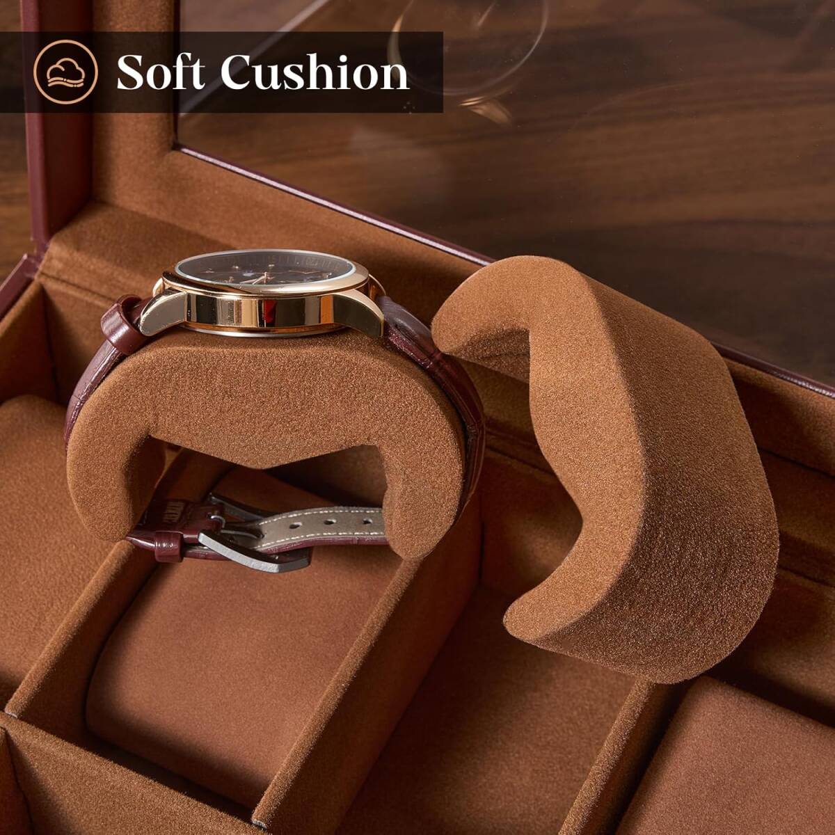透明ガラスの天板付きで、収納した時計を開けずに確認できます。