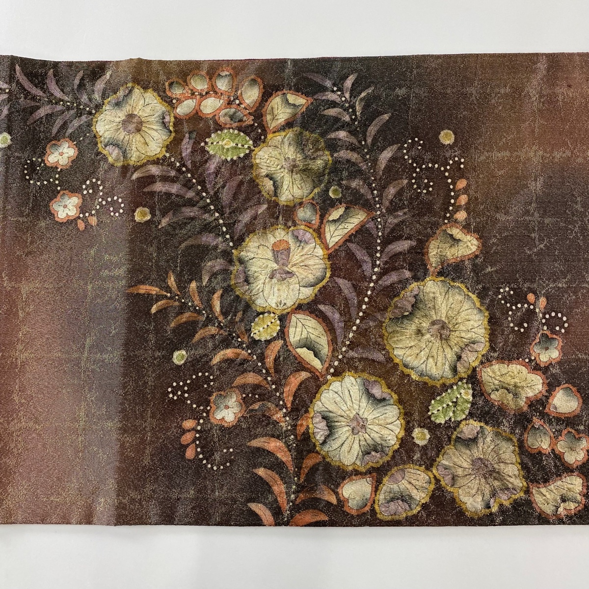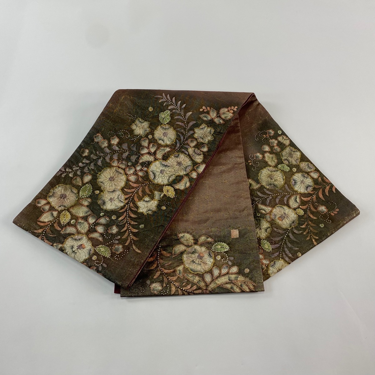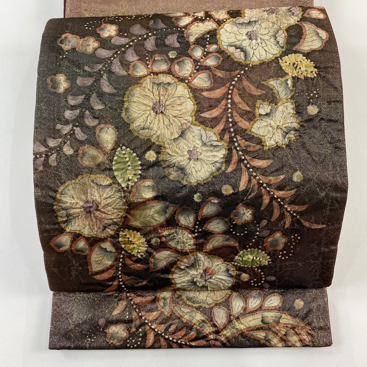 | 袋帯 美品 名品 落款 辻が花 金彩 茶紫 お太鼓柄 正絹 【中古】 |