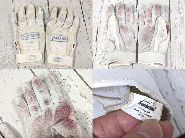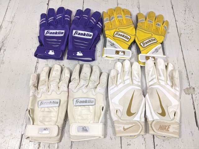 バッティンググローブ メーカー:NIKE カラー:ベージュ×ホワイト サイズ:L バッティンググローブ メーカー:Franklin カラー:ホワイト サイズ:L バッティンググローブ メーカー:Franklin カラー:イエロー×グレー サイズ:S バッティンググローブ メーカー:Franklin カラー:パープル×ホワイト サイズ:M ※商品一つ一つの梱包は行っておりません。 その為、まとめて梱包した状態での発送とさせていただきます。 -------------------- その他多数商品を出品中!! 出品商品一覧は→こちらをクリック -------------------- | ||||||||||||