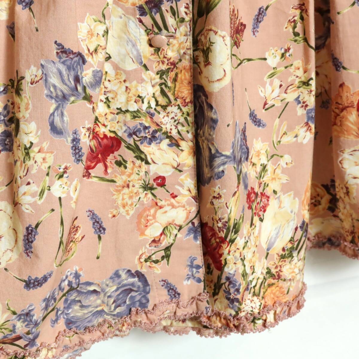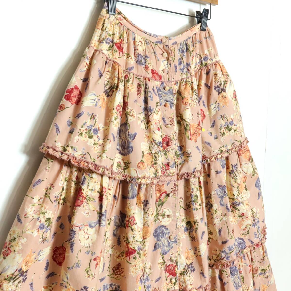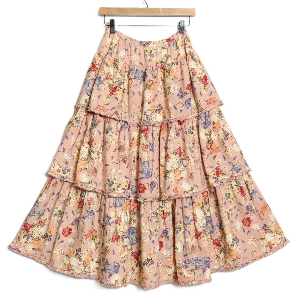 商品説明 | 【実寸約】ウエスト63丈87(cm) 【サイズ表記】 なし。実寸をご参照くださいませ。 【素材】 綿100% 【状態】普通の使用感のあるお品物 薄シミ数か所あり 【デザイン】ピンク系 フラワープリントがキュートなロングスカートです。 総かぶせ段々フリルがゴージャス! かぶせ段々の一枚一枚にピコフリル&ピコレースが付いています。 ギャザーたっぷりでボリュームのあるシルエット♪ これ一枚でもレイヤードでもロマンティックコーデに大活躍する優秀アイテム! |