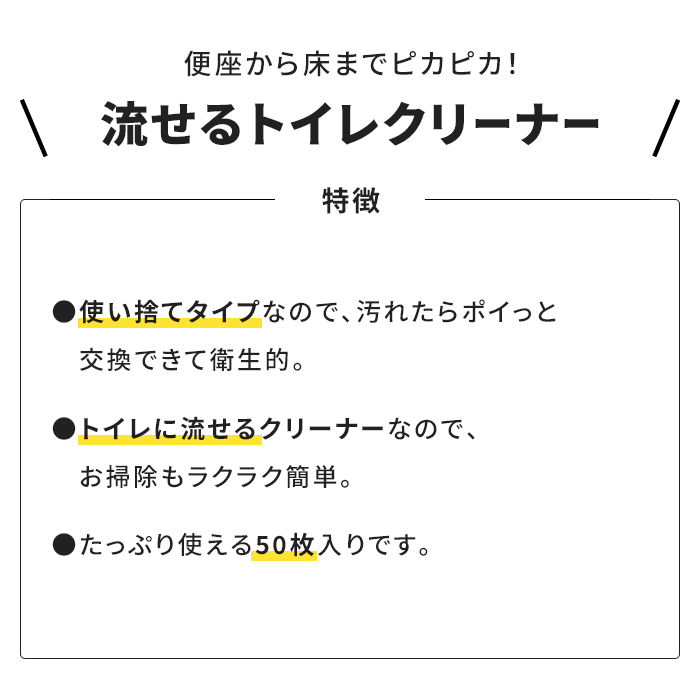 流せる トイレクリーナー 50枚入り 除菌 トイレ掃除シート おそうじシート トイレ掃除 シート クリーナー 使い捨て 便利 清潔 衛生的 防災 災害 備え 新生活 一人暮らし |