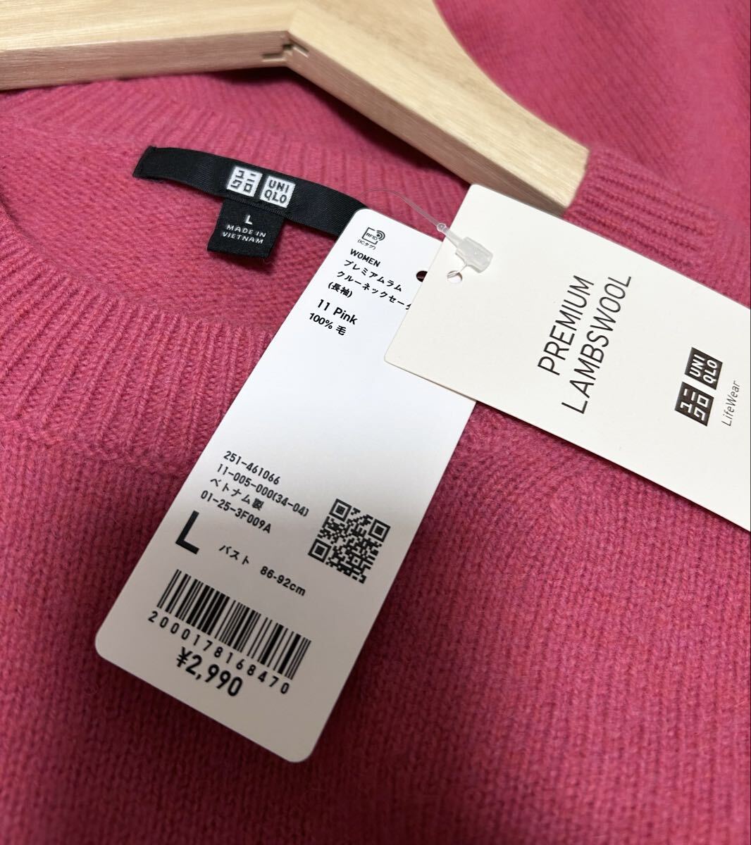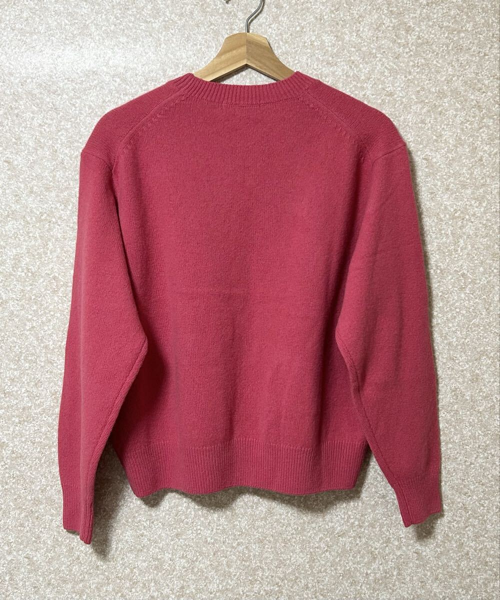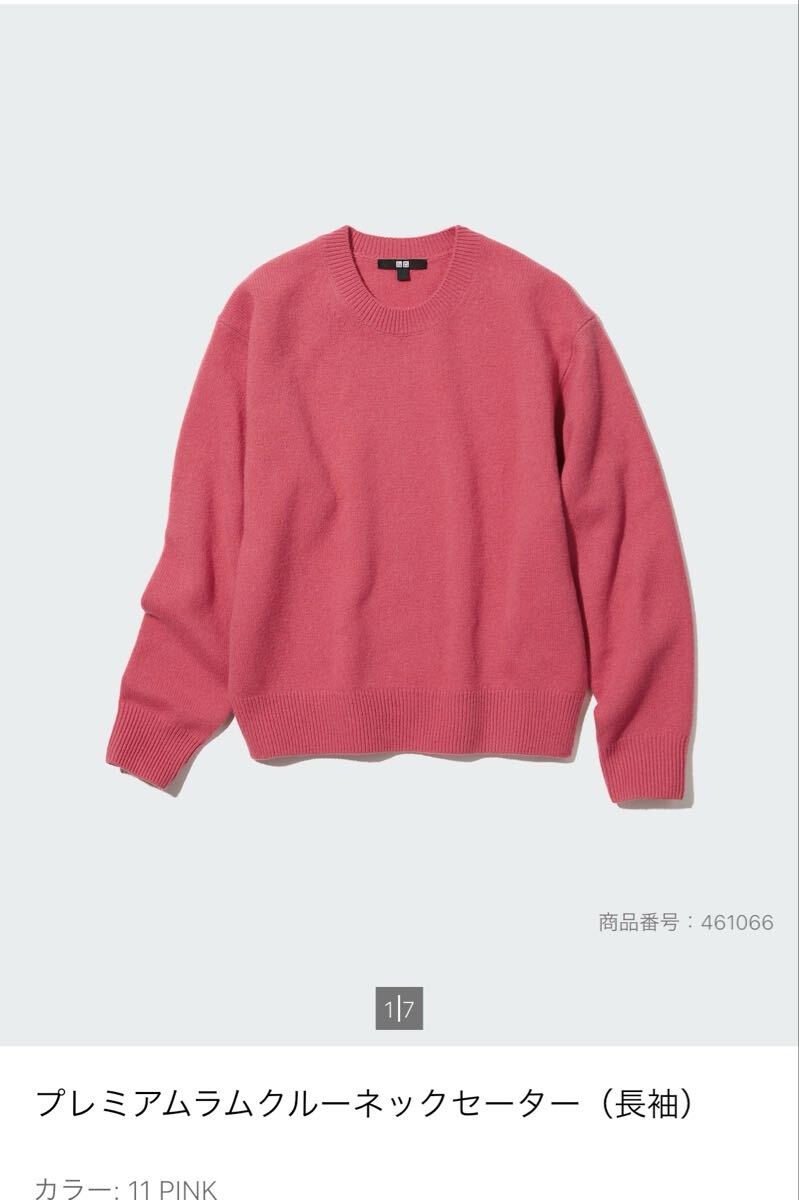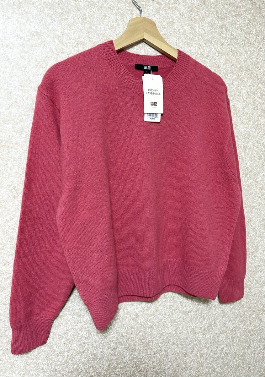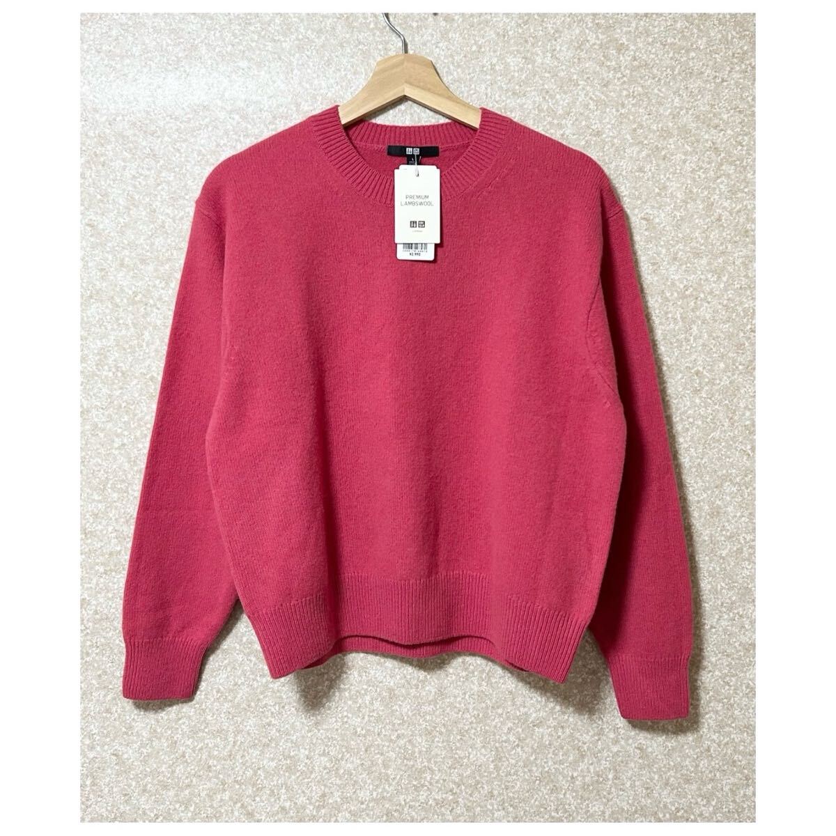 UNIQLO(ユニクロ)のプレミアムラムクルーネックセーターです。未使用です。お色味はピンク系で写真8枚目が比較的実物と1番近いお色味です。サイズはLサイズですがLサイズよりもゆったり目のお作りです。