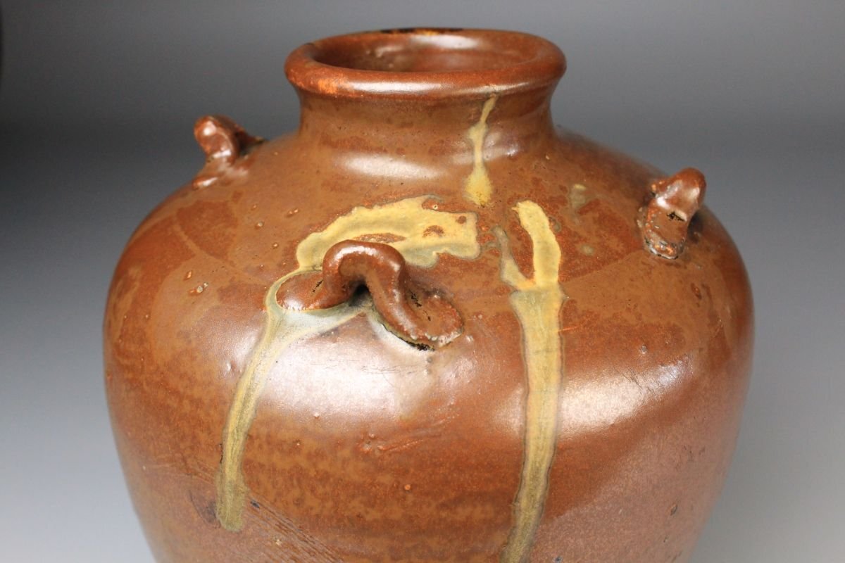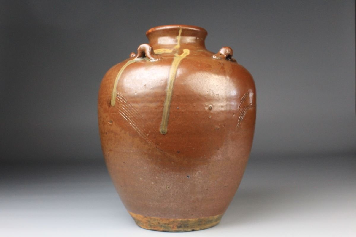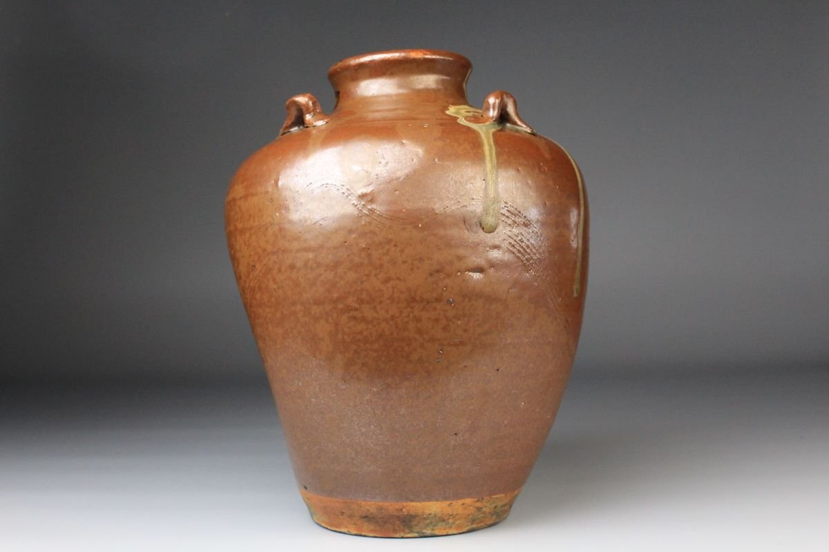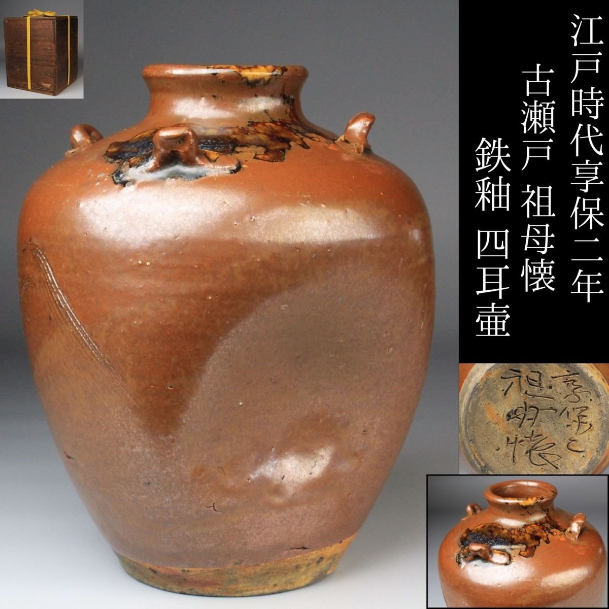 * * * 商品詳細 * * * ここでしか出逢うことのできない唯一の美をご紹介させて頂きます。 こちらは、江戸時代・享保二年 古瀬戸 祖母懐 鉄釉 四耳壷でございます。 堂々とした祖母懐形の胴に、四耳を備えた重厚な造形。柿色とよる深みある黒が混じり合い、窯変の妙が織りなす景色はまさに古瀬戸ならではの渋美を感じさせます。 さらに本作の底面には、享保二年の年号が彫り込まれており江戸中期の陶磁史を語る上でも重要な位置を占める作品といえるでしょう。 四耳の造形は実用性を備えると同時に、器全体に荘重な趣を与えています。鉄釉の黒と柿色の対比が力強さと温かみを同時に生み出し、古瀬戸の真髄を伝える格調高い壷として、鑑賞においても優れた存在感を放ちます。 ■商品内容/ 壷、箱 ■サイズ/横15.5㎝×高22㎝ 箱:横22㎝×高27.5㎝×奥行21.5㎝ ■状態/ スレ、傷、汚れ、箱にスレ、傷、汚れ、パーツの外れ、経年による痛み、蓋の浮き、底に直し、ヒビがございます。 ※写真にてご確認、ご了承の上ご入札下さい。