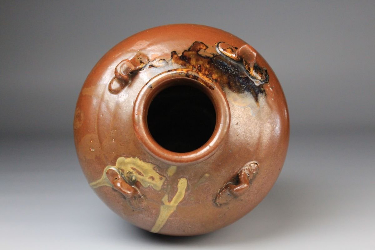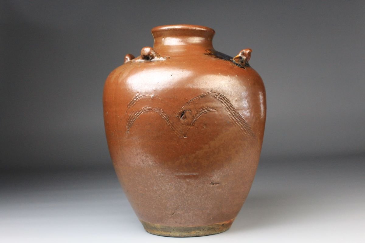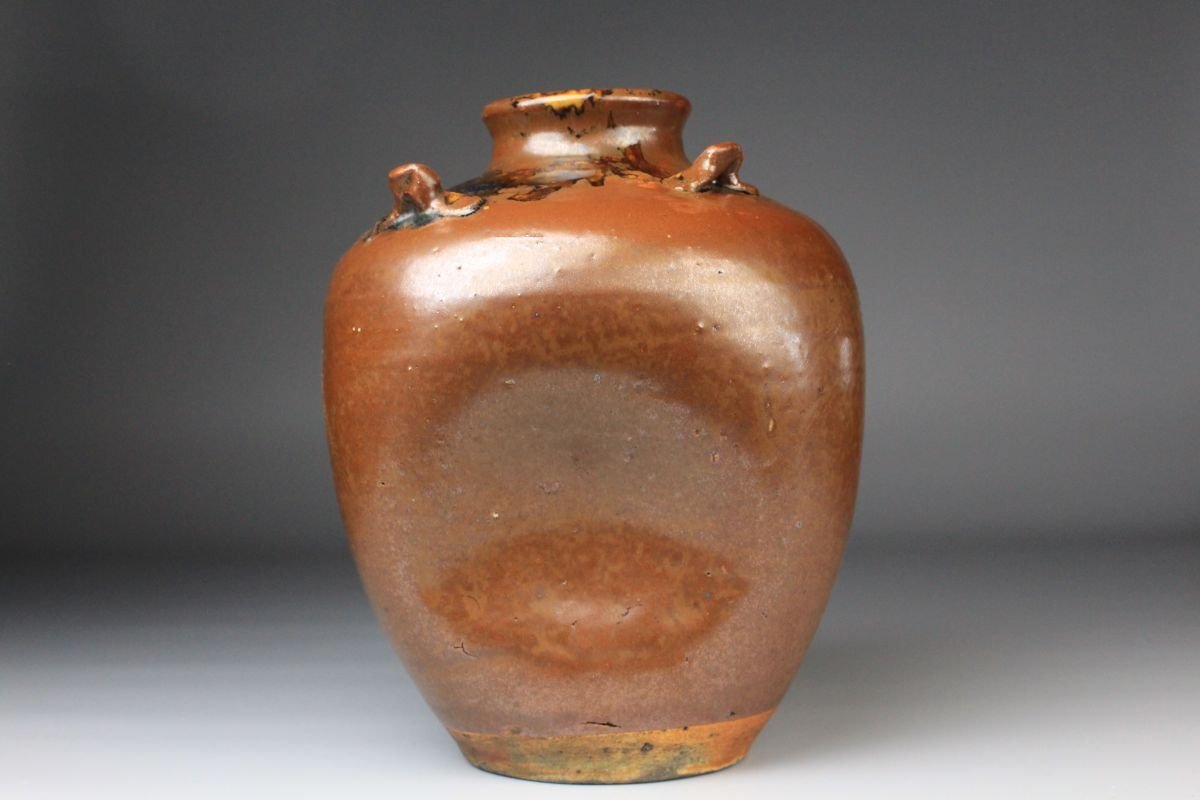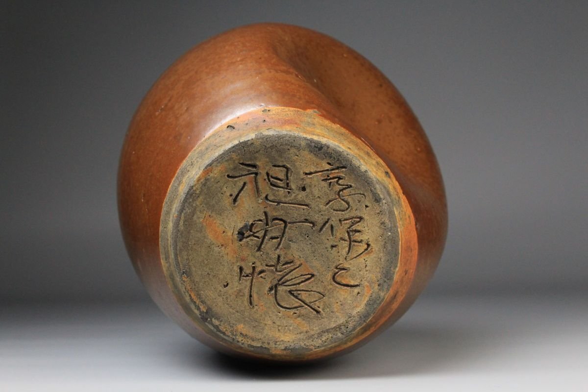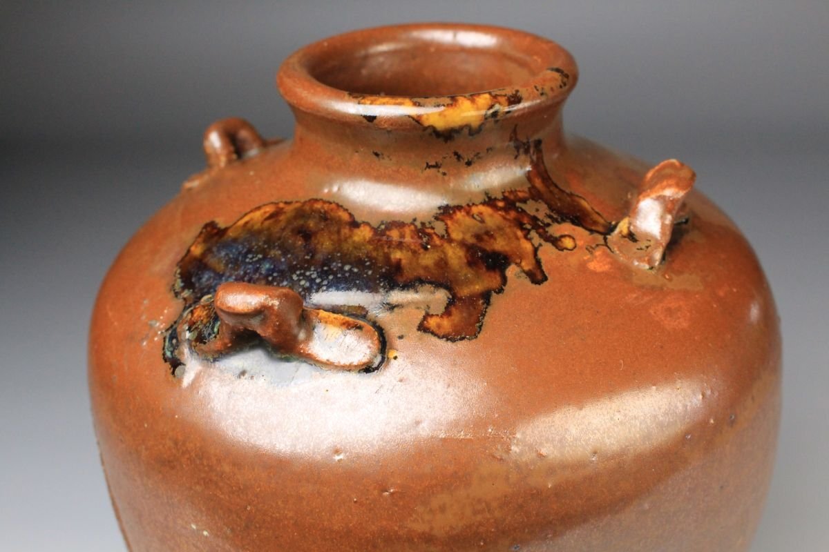 * * * 商品詳細 * * * ここでしか出逢うことのできない唯一の美をご紹介させて頂きます。 こちらは、江戸時代・享保二年 古瀬戸 祖母懐 鉄釉 四耳壷でございます。 堂々とした祖母懐形の胴に、四耳を備えた重厚な造形。柿色とよる深みある黒が混じり合い、窯変の妙が織りなす景色はまさに古瀬戸ならではの渋美を感じさせます。 さらに本作の底面には、享保二年の年号が彫り込まれており江戸中期の陶磁史を語る上でも重要な位置を占める作品といえるでしょう。 四耳の造形は実用性を備えると同時に、器全体に荘重な趣を与えています。鉄釉の黒と柿色の対比が力強さと温かみを同時に生み出し、古瀬戸の真髄を伝える格調高い壷として、鑑賞においても優れた存在感を放ちます。 ■商品内容/ 壷、箱 ■サイズ/横15.5㎝×高22㎝ 箱:横22㎝×高27.5㎝×奥行21.5㎝ ■状態/ スレ、傷、汚れ、箱にスレ、傷、汚れ、パーツの外れ、経年による痛み、蓋の浮き、底に直し、ヒビがございます。 ※写真にてご確認、ご了承の上ご入札下さい。