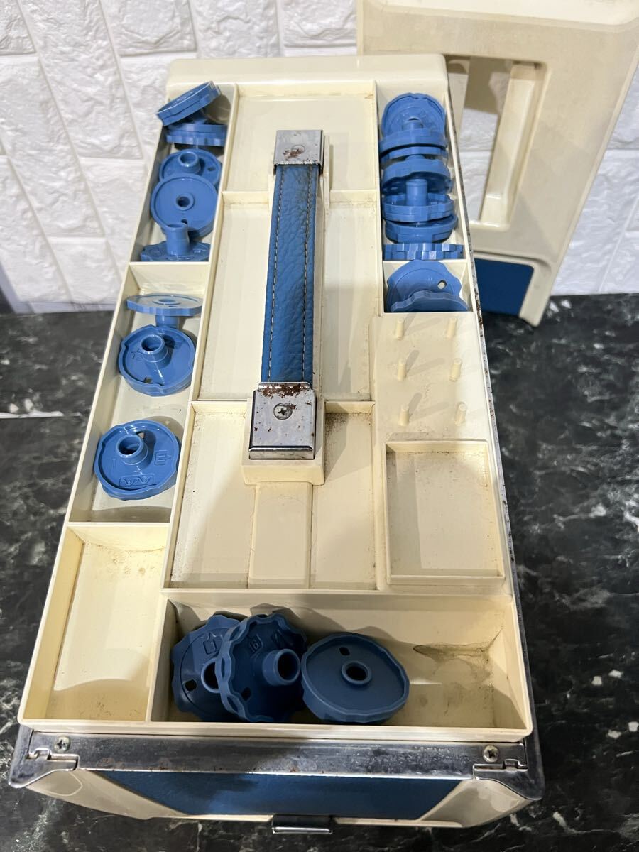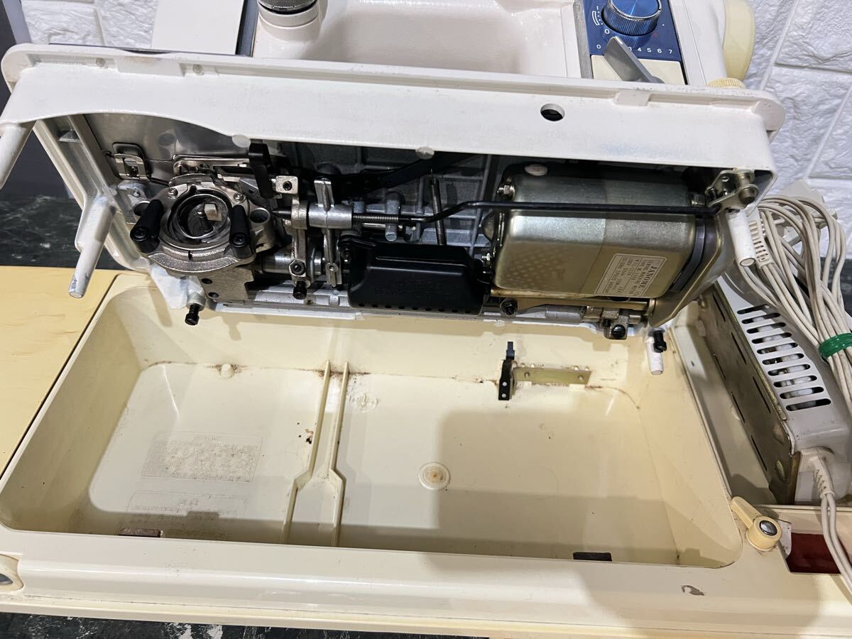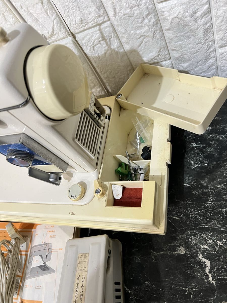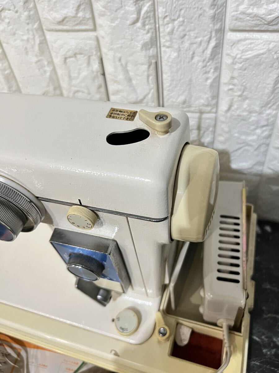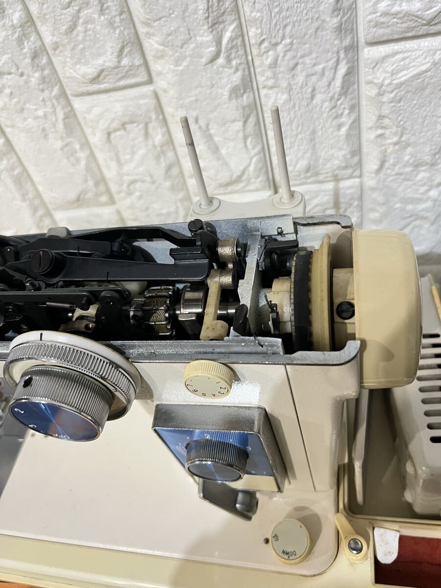使用状況 : 送り歯を確認しました。ペダルを踏むと針が上下に動きました。糸巻き機に糸を巻き取る部品の1つが欠けています(図6)。赤く丸で囲んだ部分です。