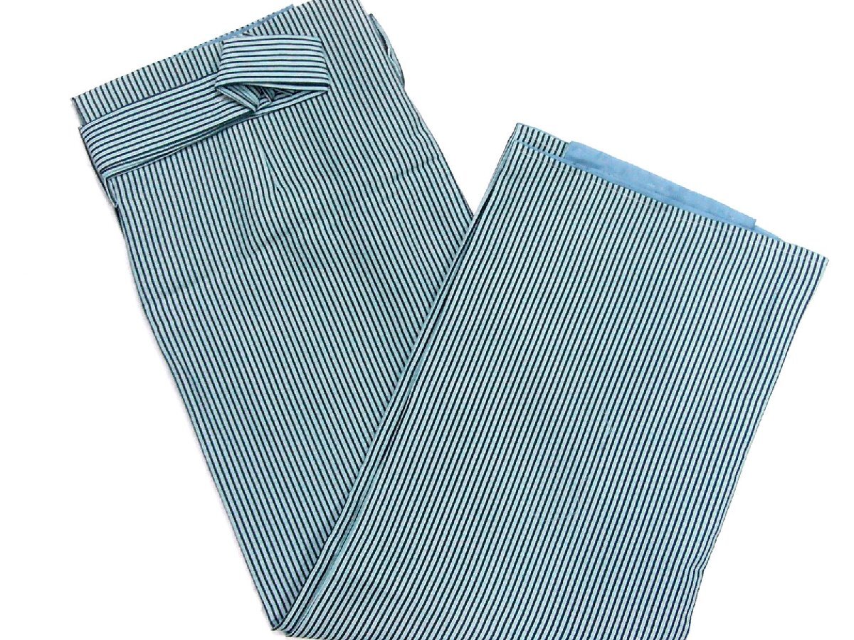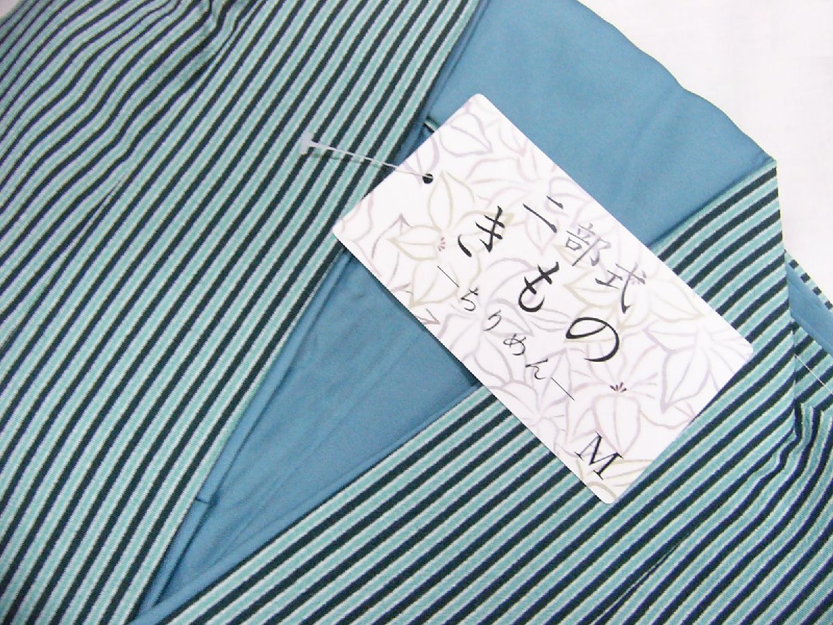緑色に少し青色を混ぜて少しくすませた水浅葱色系の地色に縞模様で落ち着いた色使いの小粋な小紋のお品になります。