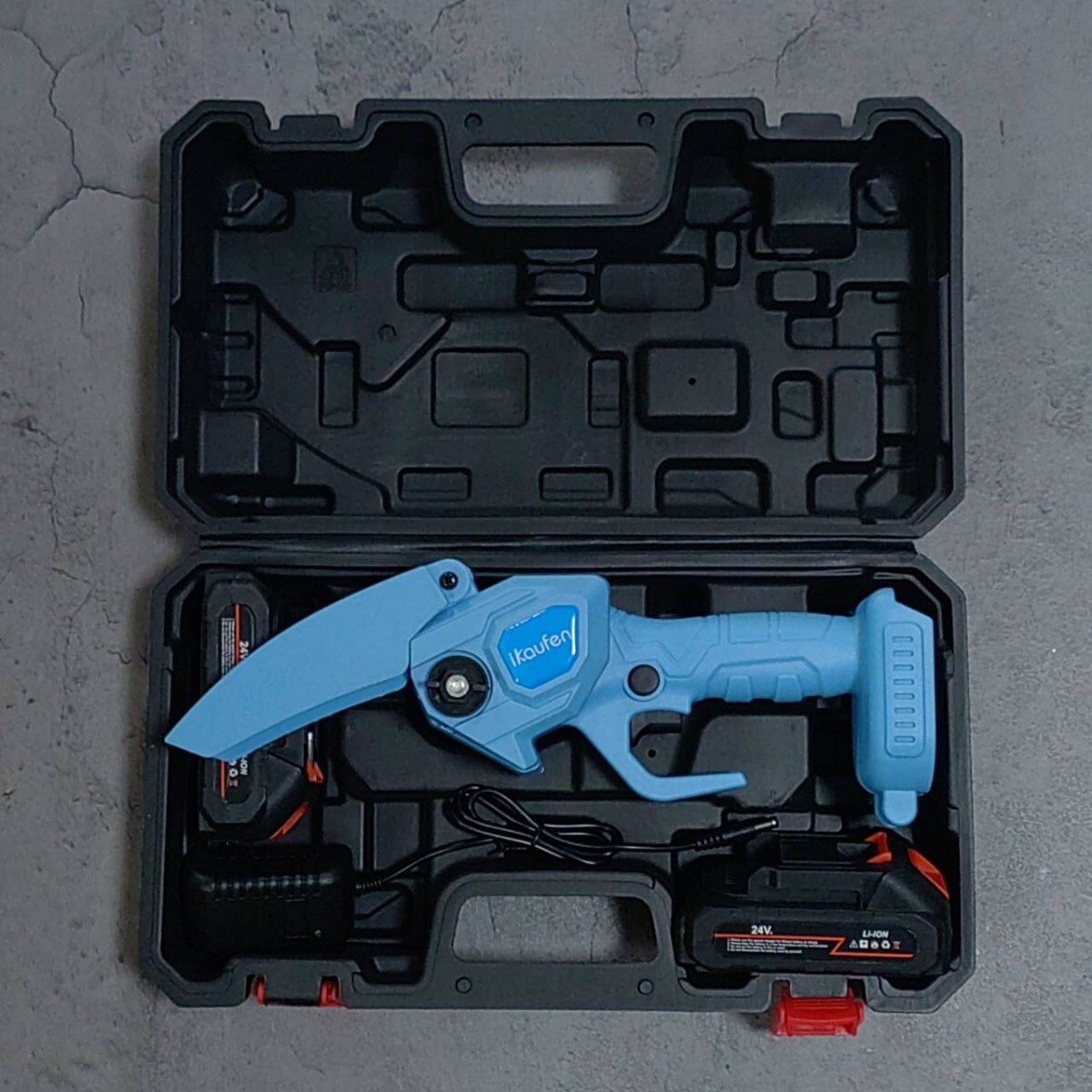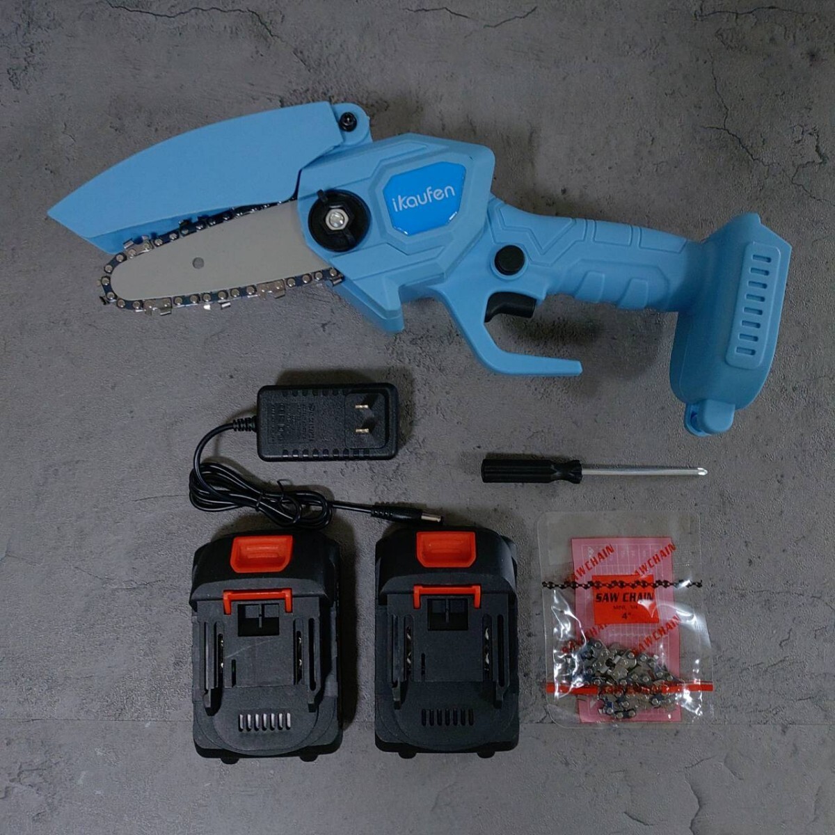 替刃1個、バッテリー2個、充電器、本体、プラスドライバーのセットになります。