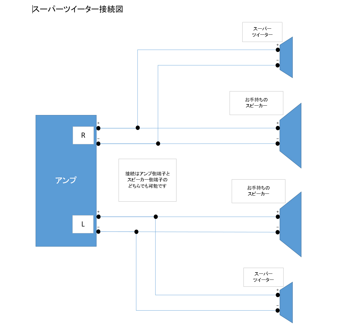 お手持ちのスピーカー(4Ω~8Ω)に並列配線していただくだけで高域の伸びが格段に上がると共に、