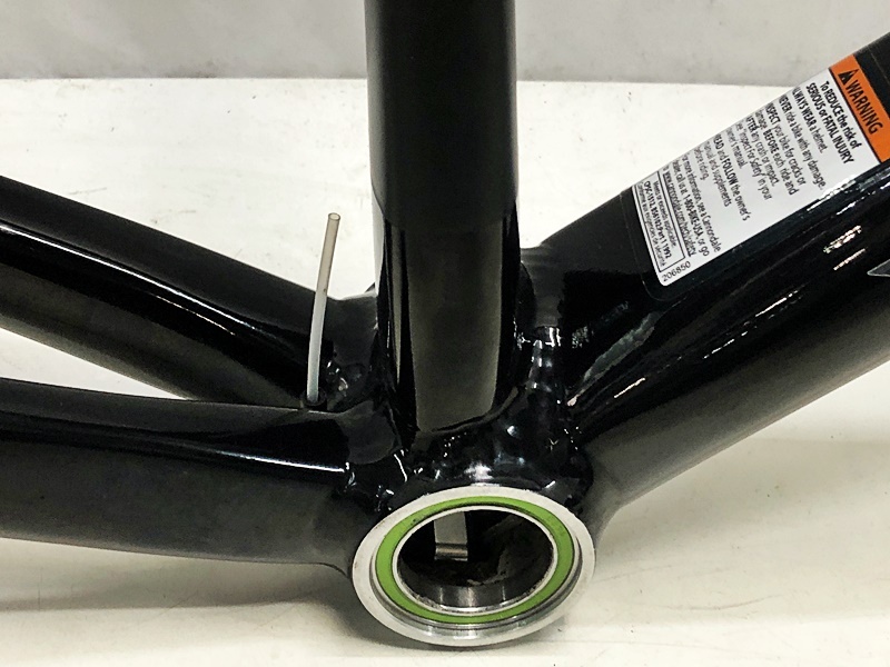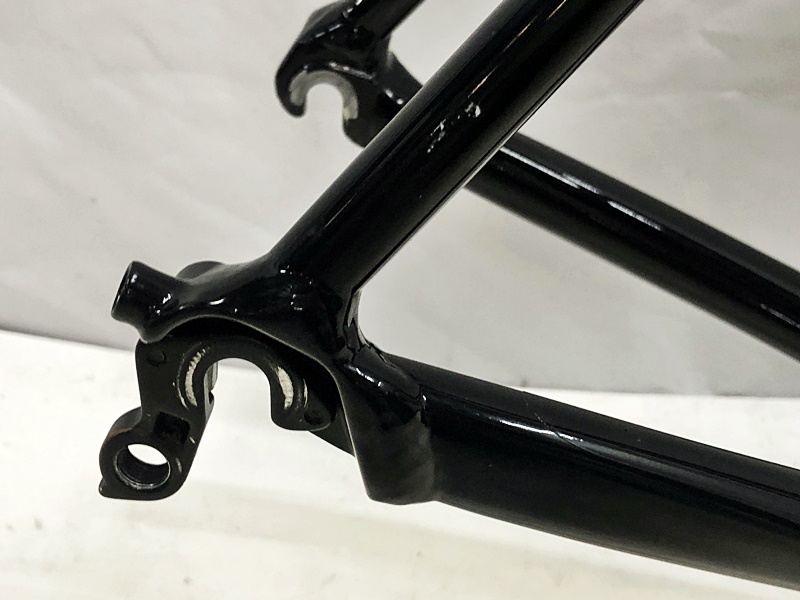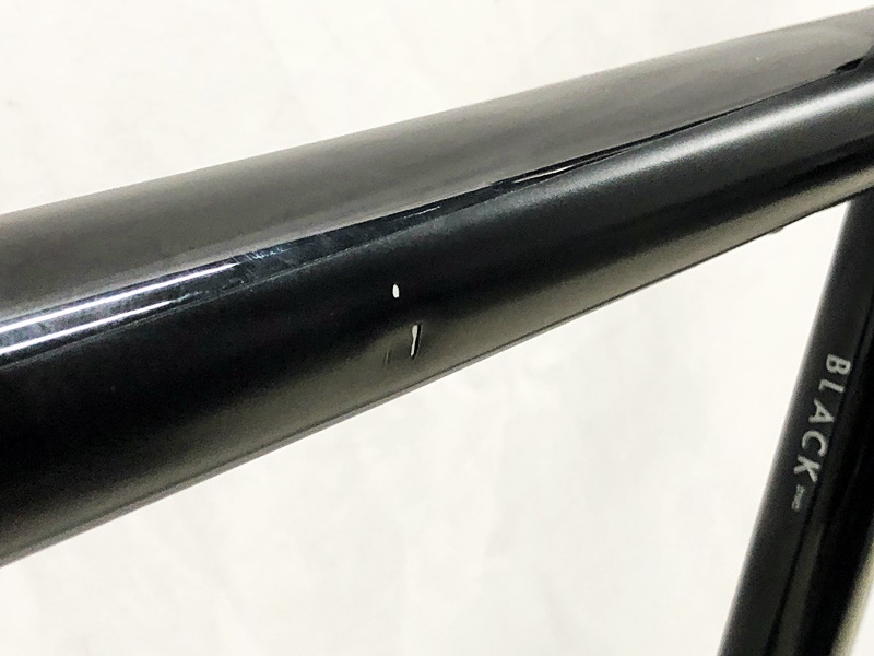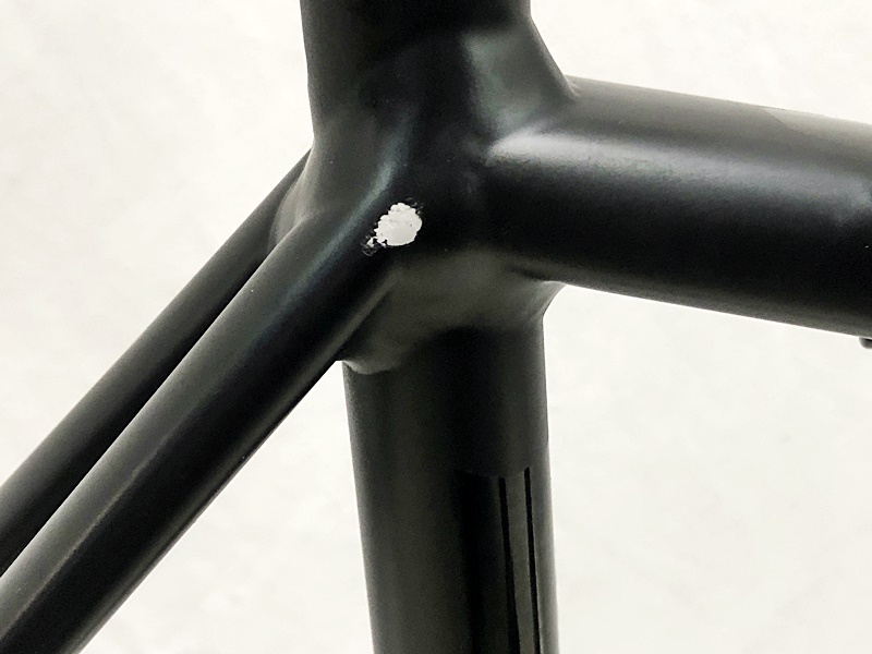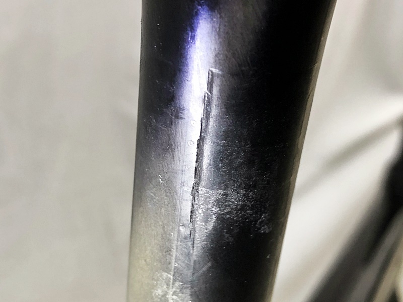 ジャンクの理由は、フレームの左トップチューブやトップチューブ下側にへこみ箇所あり、シートチューブ上部に目立つアルミ地迄達している削れ傷がある為、ジャンク品の現状お渡し商品となります。併せて、シートクランプのオーバートルクによる締め付けによる2.5cm程のクラック箇所がシートポストに見られます。