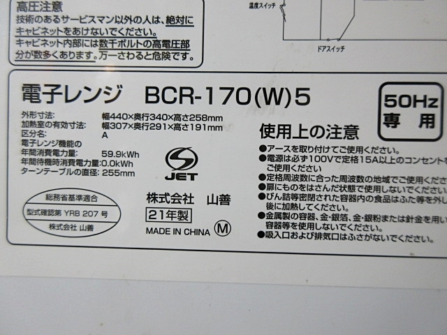 中古 50Hz専用 山善 BCR-170(W)5 単機能 電子レンジ 2021年製