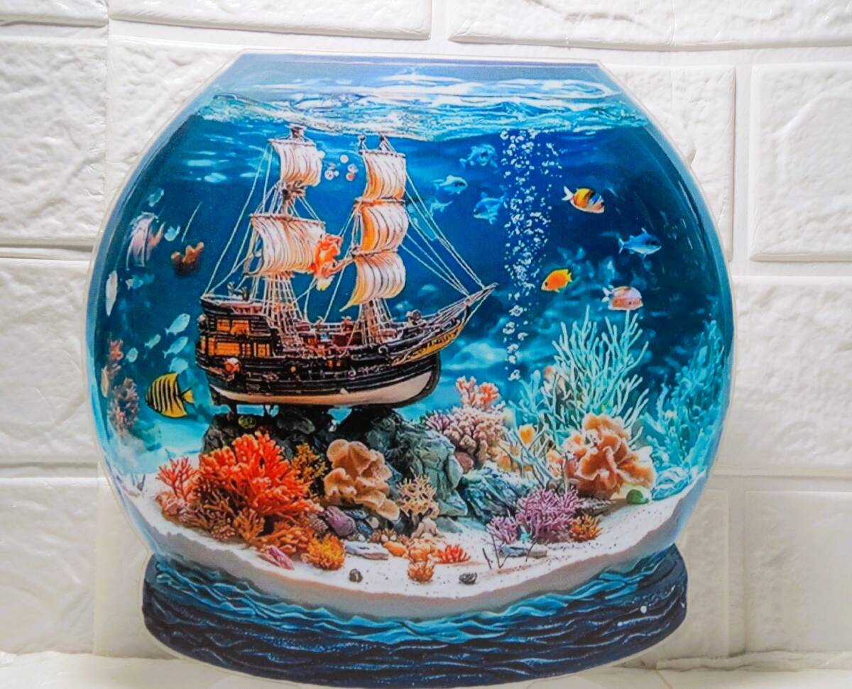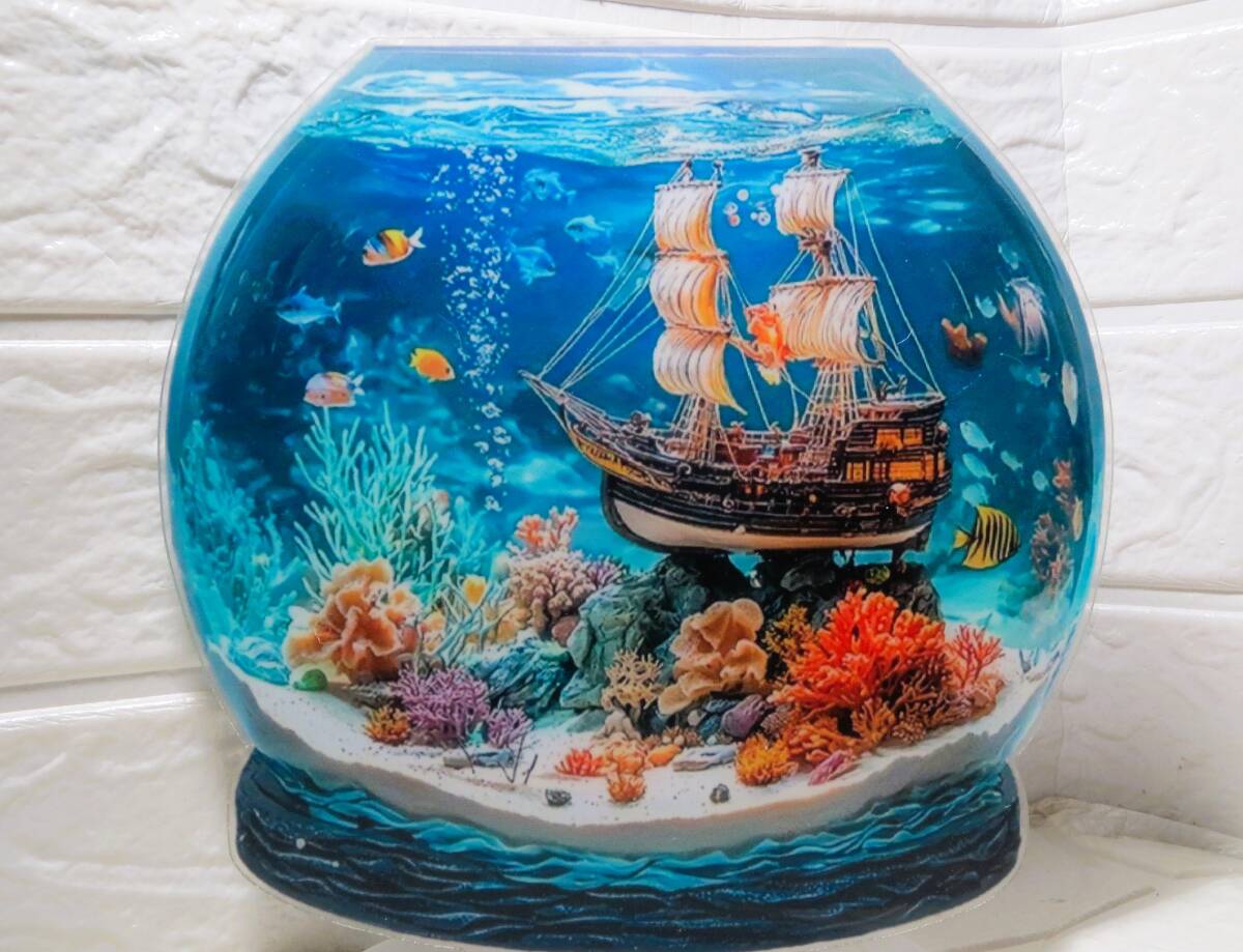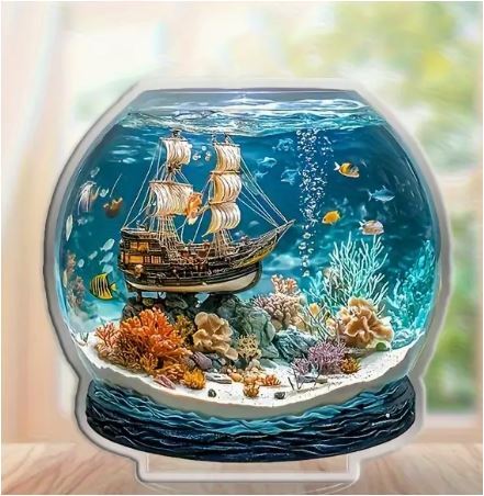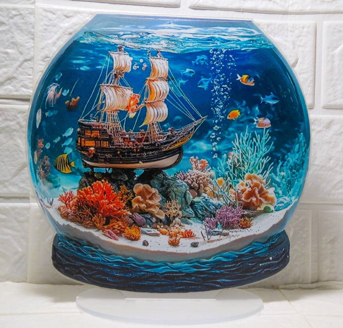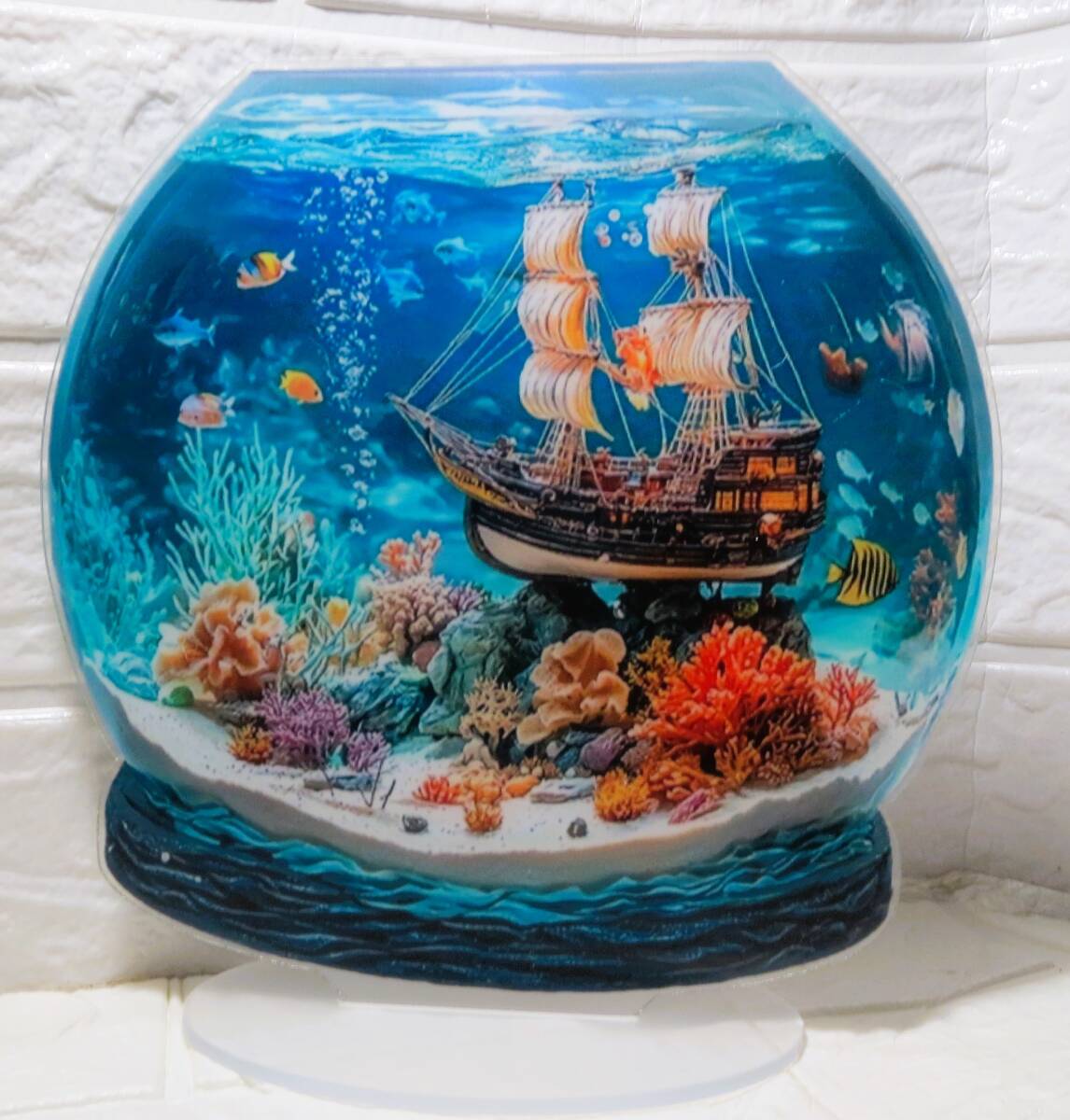 2D・漁礁の帆船に集う魚たち・立体描法のアクリルスタンド・出窓装飾・内から外から綺麗・サンキャッチャー・小型水槽のオブジェとしても